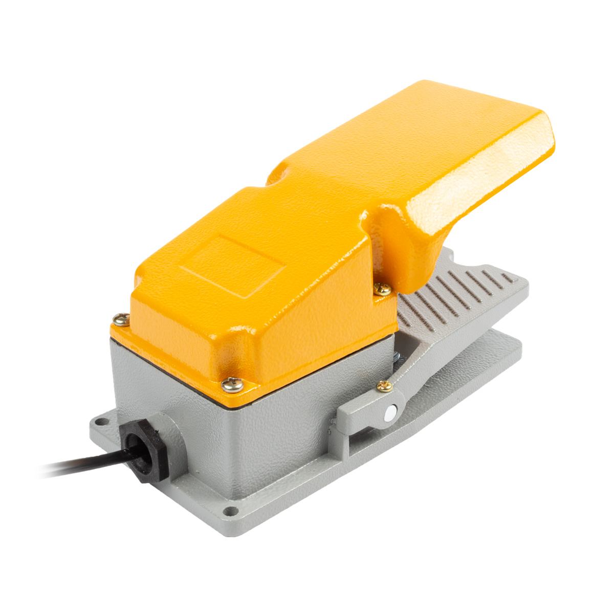 Pedał przemysłowy 230V/10A bez blokady (włącznik nożny) z osłoną ochronną. Pedał jest szczególnie przydatny do sterowania maszynami i urządzeniami przemysłowymi, dozownikami, urządzeniami pakującymi, zgrzewarkami worków i folii lub innymi urządzeniami powszechnie używanymi w pracy i produkcji przemysłowej. Cały pedał jest wykonany z lekkiego stopu aluminium i jest wyposażony w metalową osłonę ochronną, która zapobiega przypadkowemu naciśnięciu urządzenia przez operatora. Wewnątrz pedału znajduje się izostat 10A/230V ON/OFF (przełącznik bez blokady).