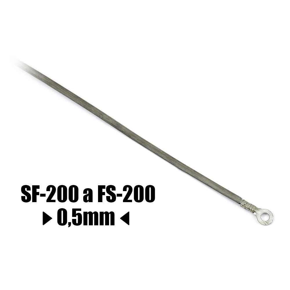 Wymienny drut oporowy do zgrzewarek impulsowych SF-200 i FS-200 Płaski oporowy drut topliwy o szerokości 0,5 mm jest zakończony oczkami do mocowania do zgrzewarki do folii. Szerokość topliwej wstęgi wskazuje kontynuacja tekstu