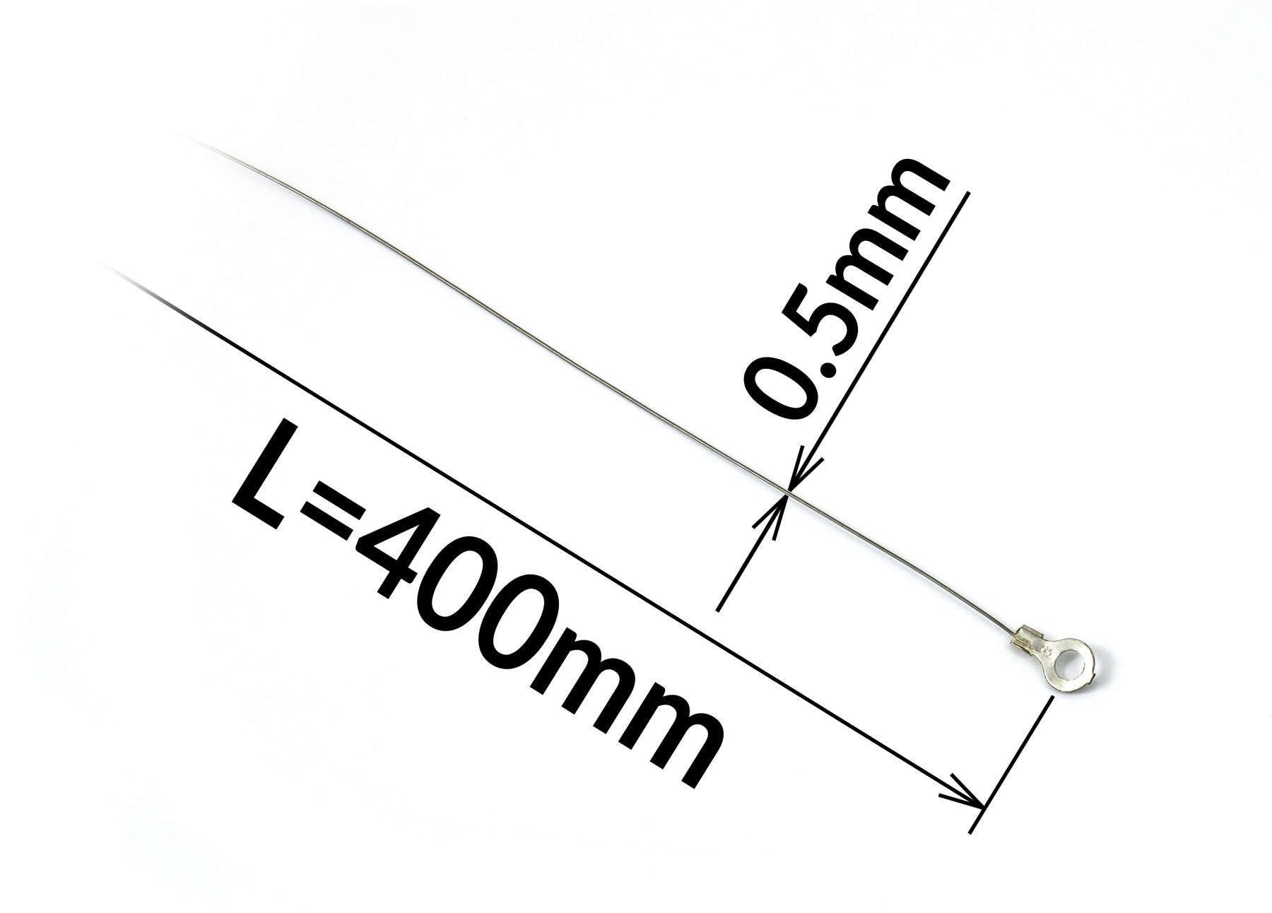 Oporowy drut tnący do zgrzewarki półtulejowej FC-400 o długości aktywnej zgrzewu 400 mm. Drut jest zakończony oczkami i ma dokładną długość wymaganą dla tej zgrzewarki (ponad 400 mm).