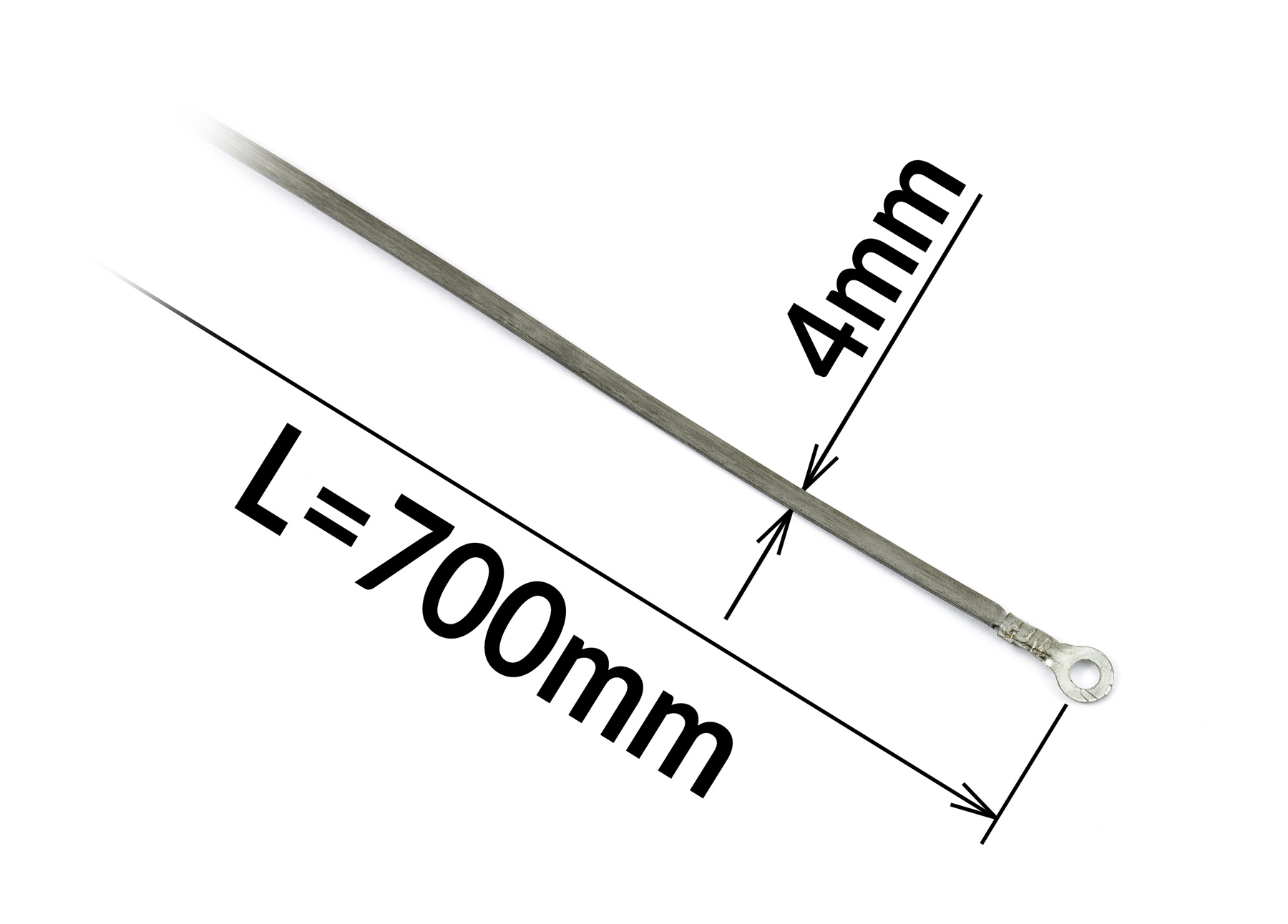 Wymienny drut oporowy do zgrzewarki do folii impulsowej FRN-700 i zgrzewarki do folii ciętej PFS-700A. Płaski oporowy drut topliwy o szerokości 4 mm jest zakończony oczkami do mocowania do zgrzewarki do folii. Szerokość topliwej wstęgi wskazuje całkowitą szerokość zgrzewu.
