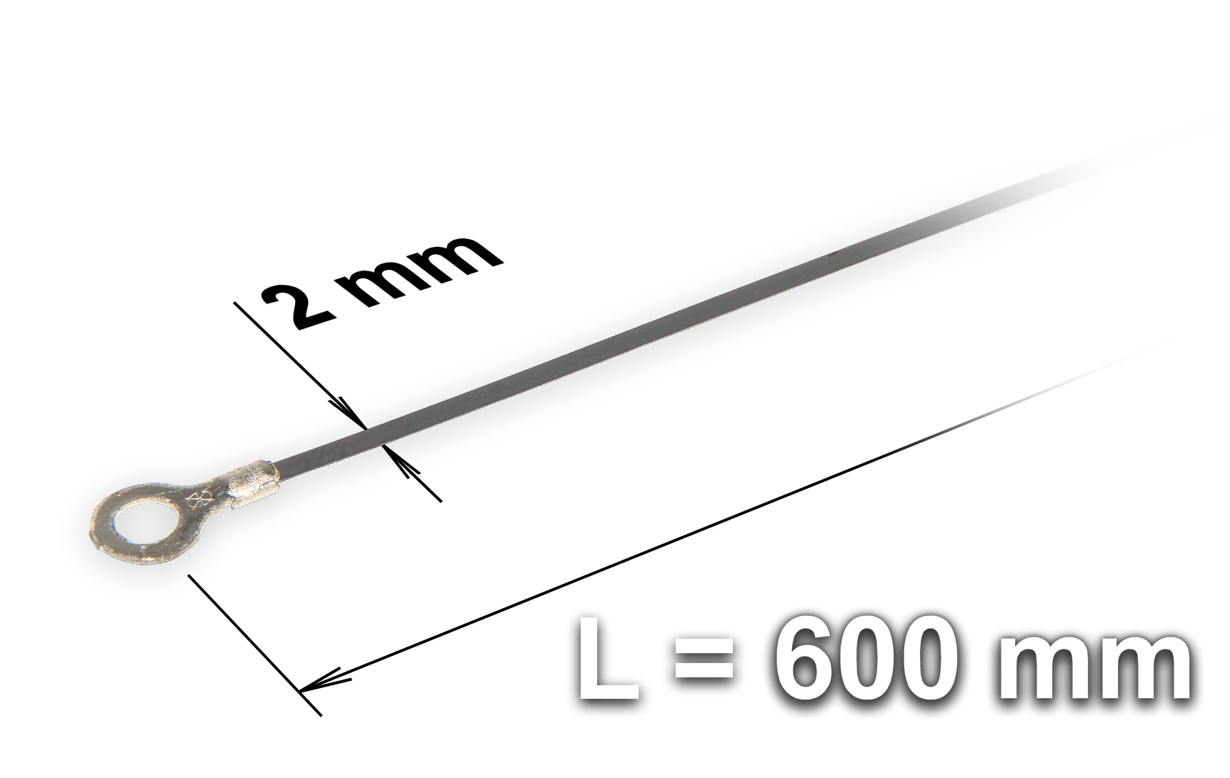 Oporowa taśma zgrzewająca o długości 600 mm do impulsowej zgrzewarki do folii z tworzywa sztucznego typu FRN-600. Oporowy drut grzejny jest zakończony z każdej strony pętlą do mocowania do styków kontynuacja tekstu