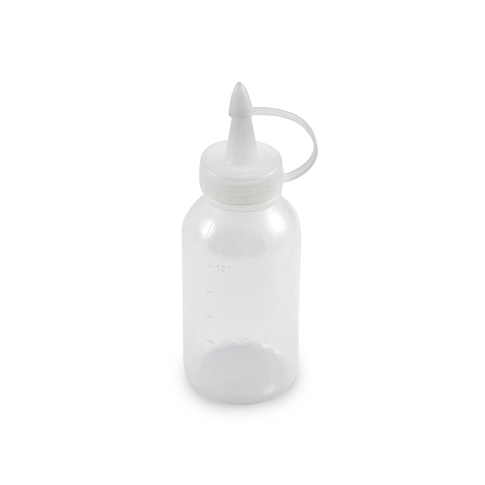 Uniwersalna butelka dozująca wykonana z miękkiego plastiku LDPE skalibrowana do 100 ml z nakrętką i końcówką, którą można przebić lub przyciąć do żądanej średnicy - tj. natężenia przepływu. Może być używana do dozowania zarówno rzadkich, jak i gęstych płynów. Butelka wykonana jest z miękkiego, elastycznego plastiku, w celu dozowania należy delikatnie ścisnąć butelkę.