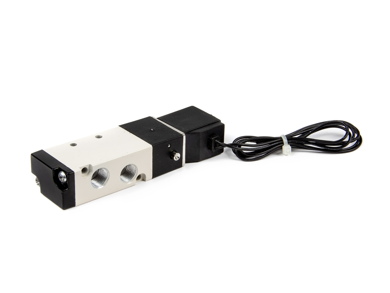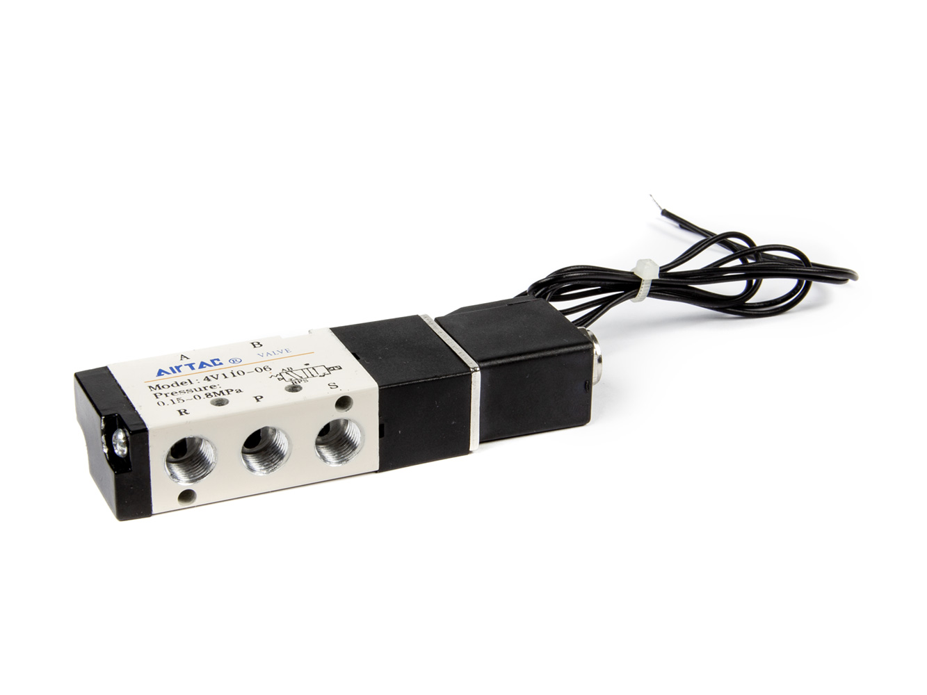 Sterowany elektrycznie zawór pięciopozycyjny z dwoma pozycjami ma jeden główny wlot (P), który służy do dystrybucji powietrza między wylotami A i B. Wlot oznaczony P rozprowadza powietrze do wylotu A lub B, w pozycji domyślnej, gdy zawór nie jest używany (cewka sterująca jest odłączona od zasilania) powietrze przepływa przez wlot P do wylotu A, gdy zawór jest przełączany, wlot A jest odłączony od zasilania, a powietrze przepływa przez wylot B. Pozostałe dwa wyloty oznaczone R i S to przedmuchy, które służą do obniżenia ciśnienia powietrza lub do regulacji ciśnienia powietrza po podłączeniu przepustnicy. W praktyce możliwe jest na przykład dostosowanie prędkości posuwu tłoka pneumatycznego w dozowniku płynu za pomocą deflatora i zaworu dławiącego. Sterowanie zaworem działa przy napięciu stałym 24 V i poborze prądu ok. 0,1A. Wejście zasilania zaworu jest realizowane przez przewody z luźnymi końcówkami o przekroju 0,35 mm i długości 20 cm.