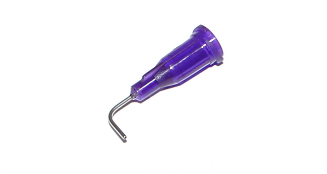 Dozujące igły aplikacyjne z tępą kaniulą wygiętą pod kątem prostym do aplikacji materiałów w trudno dostępnych miejscach. Kaniula każdej igły jest wykonana ze stali nierdzewnej i zamontowana za pomocą kleju w nylonowej szyjce z gwintowaną blokadą do przykręcenia do kartridża. Każda z igieł jest wyposażona w gwintowany system blokujący do niezawodnego i szybkiego mocowania do kartridża dozującego, strzykawki lub ręcznego dozownika.