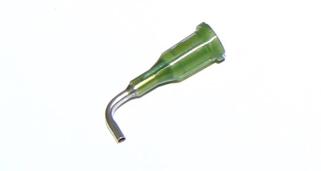 Dozujące igły aplikacyjne z tępą kaniulą wygiętą pod kątem prostym do aplikacji materiałów w trudno dostępnych miejscach. Kaniula każdej igły jest wykonana ze stali nierdzewnej i zamontowana za pomocą kleju w nylonowej szyjce z gwintowaną blokadą do przykręcenia do kartridża. Każda z igieł jest wyposażona w gwintowany system blokujący do niezawodnego i szybkiego mocowania do kartridża dozującego, strzykawki lub ręcznego dozownika.