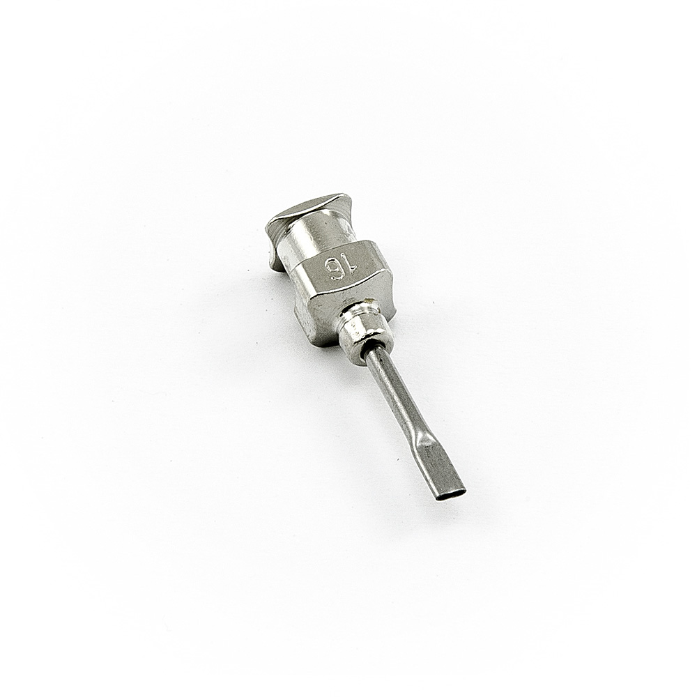 Płaskie (spłaszczone) igły dozujące ze stali nierdzewnej z kaniulą o długości 0,5" (12,7 mm) do dokładnego dozowania płynów o średniej i wysokiej lepkości ze standardowymi gwintami luer-lock i luer-slip.