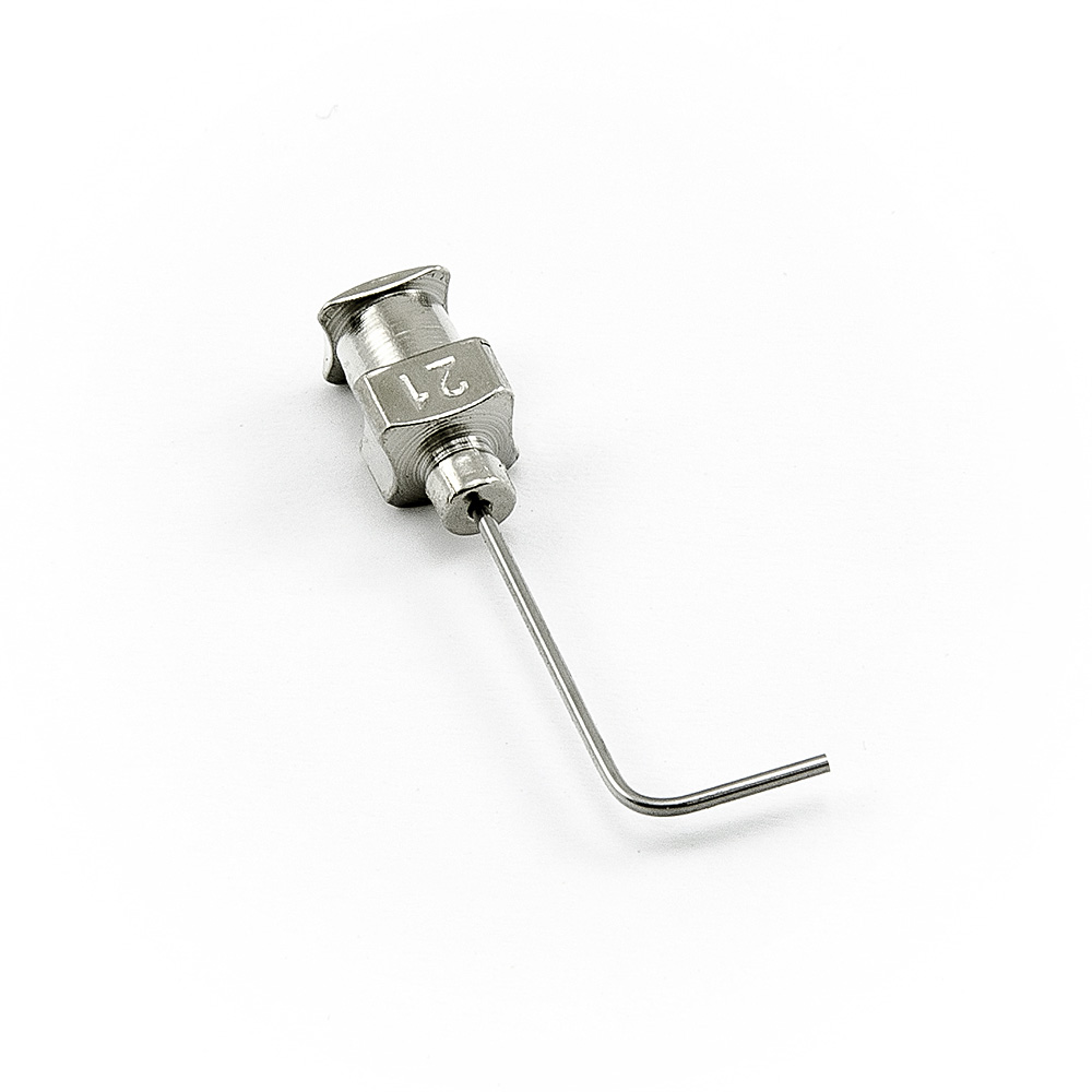 Zakrzywiona igła dozująca jest wykonana w całości z metalu - stali nierdzewnej, a jej koniec jest wygięty