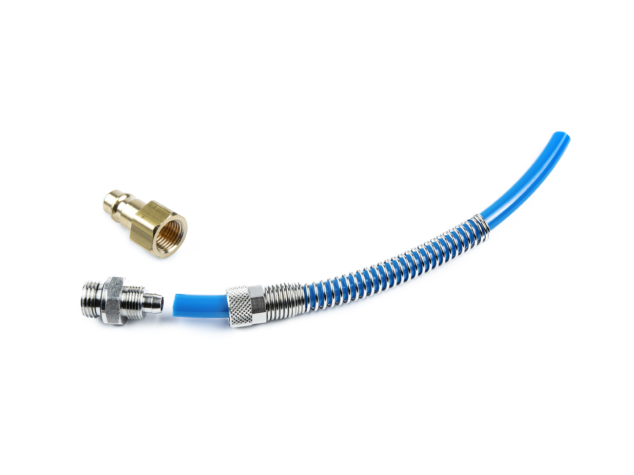 Szybkozłącze pneumatyczne do podłączenia węża 6 mm do gwintu 1/4" z osłoną węża. Proste, całkowicie metalowe złącze jest przeznaczone do węża o średnicy zewnętrznej 6 mm, wystarczy przełożyć wąż przez osłonę węża, przymocować do zaślepki 6 mm i przykręcić, sprężynowa osłona węża zapobiega pęknięciu lub zgnieceniu węża.