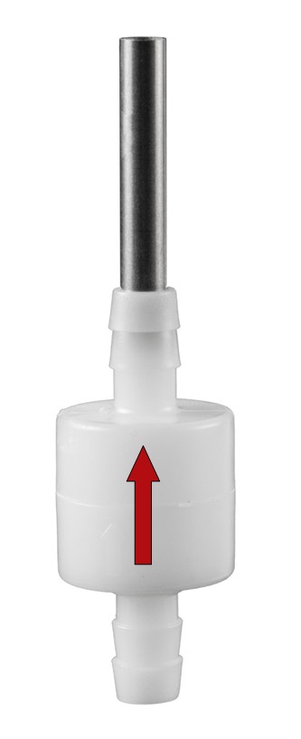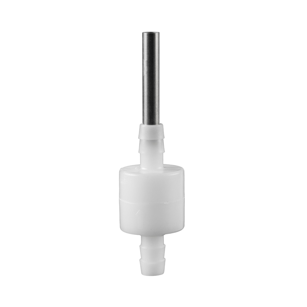 Plastikowy zawór zwrotny PE z igłą ze stali nierdzewnej 5 mm do węży 8 mm.