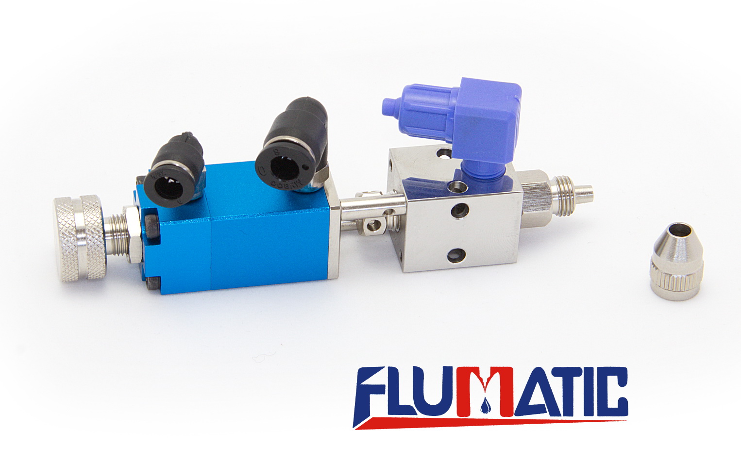 Precyzyjny zawór do mieszania i dozowania materiałów dwuskładnikowych. Proporcje mieszania składników można regulować w zakresie od 1:1 do 1:10. Wylot zaworu jest przystosowany do umieszczenia mieszalnika statycznego, którego pozycja jest ustalana przez dokręcenie nakrętki oporowej. Dwa składniki są wytłaczane jednocześnie i mieszane w mieszalniku statycznym, który służy jako aplikator.