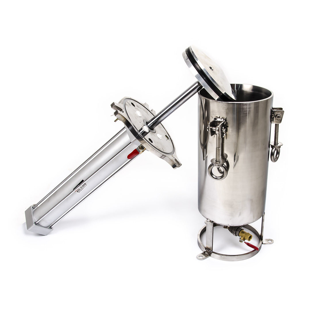 , jest wlewany bezpośrednio do zbiornika ciśnieniowego ze stali nierdzewnej, podobnie jak w przypadku nabojów i strzykawek. Ciecz jest wypychana przez dolny wylot (gwint wewnętrzny G 1/4") przez potężny tłok, który jest sterowany ciśnieniem na dwa sposoby. Poprzez dostarczanie sprężonego powietrza do górnego cylindra tłoka - bardziej odpowiednie dla mniej i średnio lepkich materiałów, lub poprzez dostarczanie sprężonego powietrza do samej głowicy tłoka wewnątrz zbiornika ciśnieniowego, przez pokrywę zbiornika ciśnieniowego. Nawet najbardziej lepkie ciecze mogą być przemieszczane w ten sposób.