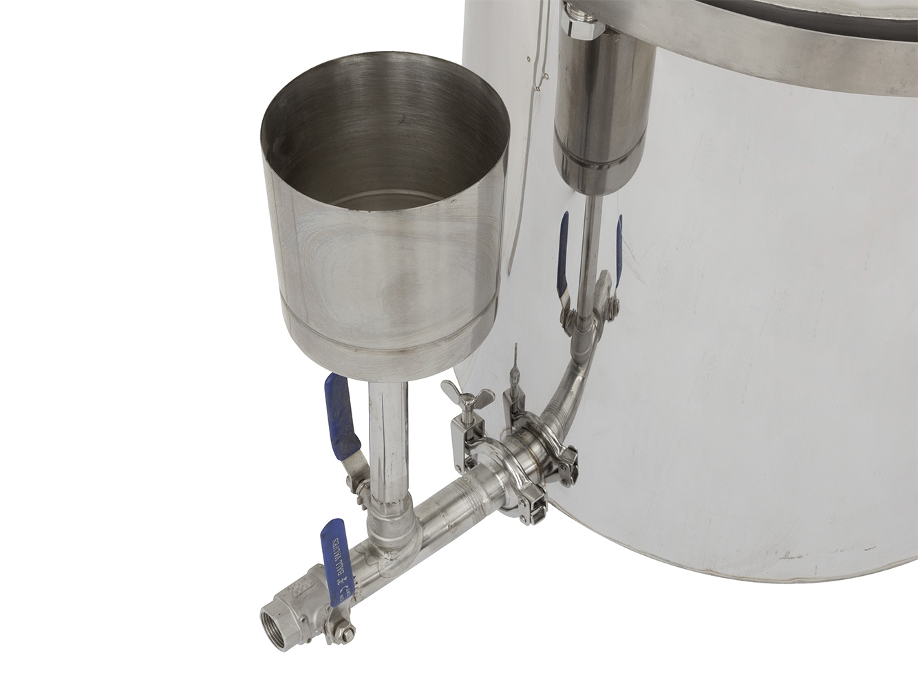 Drugą częścią kolumny jest duża chłodnica, która jest zbudowana na regulowanych nogach, opary z kotła wytwarzane przez destylację natychmiast skraplają się w chłodnicy i zamieniają się z powrotem w ciecz, która następnie wypływa przez odpływ do przygotowanego pojemnika. Chłodnica składa się z zamkniętej rury, która jest zanurzona w zimnej wodzie w celu lepszego odprowadzania ciepła z chłodnicy, w zestawie znajduje się pompa zanurzeniowa, która jest umieszczona w dowolnym większym pojemniku z zimną wodą, która jest następnie wtryskiwana przez wąż do chłodnicy i jednocześnie odprowadzana z powrotem do pompy, tworząc w ten sposób zamknięty cykl chłodzenia. Pomiędzy bojlerem a skraplaczem umieszczona jest rura o długości 75 cm, służąca do przenoszenia oparów pomiędzy dwiema częściami destylatora. Pokrywa i przewody rurowe nie są mocno przymocowane do kotła lub skraplacza, co pozwala uniknąć ryzyka wybuchu, gdy kolumna jest pod ciśnieniem. Nie zastosowano żadnych uszczelek na orurowaniu i pokrywie bojlera, ale rowki są wypełnione wodą; woda w rowku zapobiega wyciekowi pary, a tym samym służy jako uszczelnienie wodne. W zestawie znajduje się również termometr, który po prostu przykręca się do rury kotła, termometr służy do natychmiastowego sprawdzania temperatury pary podczas procesu destylacji. Całe urządzenie wykonane jest z solidnej stali nierdzewnej. Całkowita objętość wewnętrzna kolumny wraz z przestrzenią pod pokrywą wynosi 150 l. Bojler może być wypełniony cieczą o maksymalnej objętości 138 l.