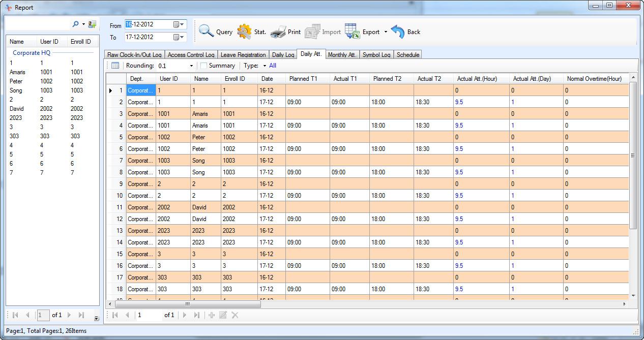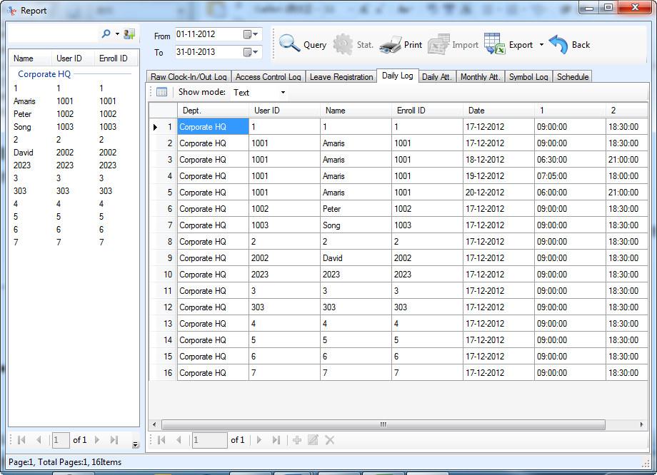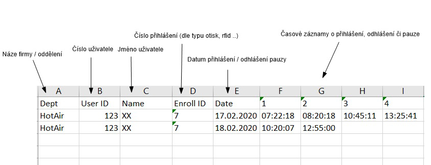 Dane wyjściowe rekordów to plik Excel (xls), który zawiera tabelę informacji o dostępie dla każdego użytkownika z zapisem czasu przybycia, przerwy i wyjścia. System może również rejestrować wiele przerw. Dodawanie i usuwanie użytkowników odbywa się bezpośrednio za pośrednictwem terminala lub dołączonego oprogramowania. Aplikacje PC (Windows) mogą być chronione hasłem, aby uniemożliwić dostęp innym użytkownikom. Aplikacja umożliwia również śledzenie ruchu i zapisów w czasie rzeczywistym, a operator komputera może natychmiast zobaczyć każdy ruch osób za pośrednictwem systemu e-obecności.