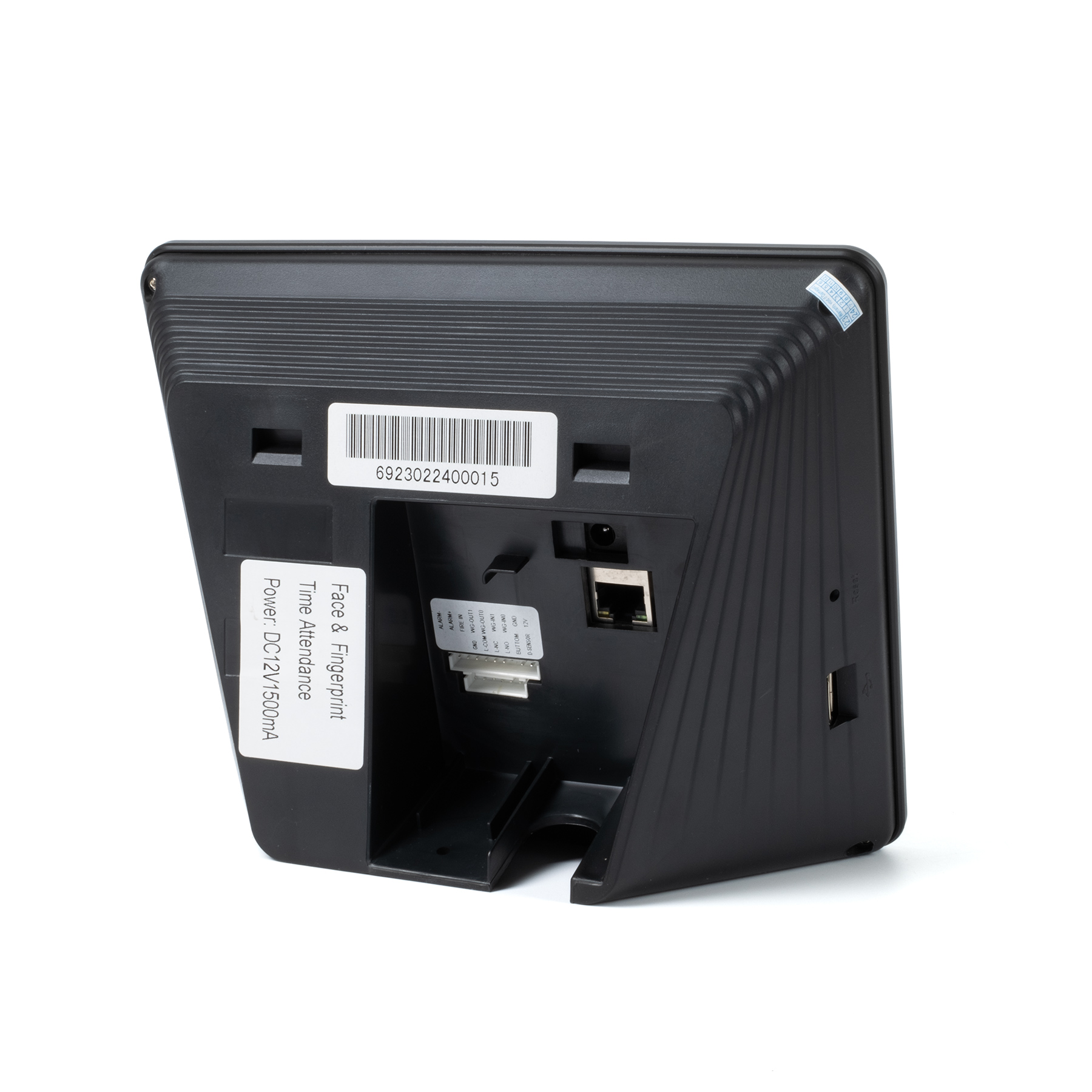 System obecności można podłączyć do sieci przez WiFi lub LAN, a w razie potrzeby zebrane dane obecności można w dowolnym momencie pobrać na pamięć USB. System obecności jest zasilany przez zasilacz gniazdkowy 12V/1,5A i posiada zintegrowaną baterię zapasową, która utrzyma działanie systemu przez maksymalnie trzydzieści minut w przypadku awarii zasilania. Z tyłu, oprócz złącza zasilania, znajduje się również wtyczka do podłączenia kabla zasilającego oraz styki do komunikacji Wiegand, przycisku drzwi, przekaźnika, dzwonka lub alarmu.