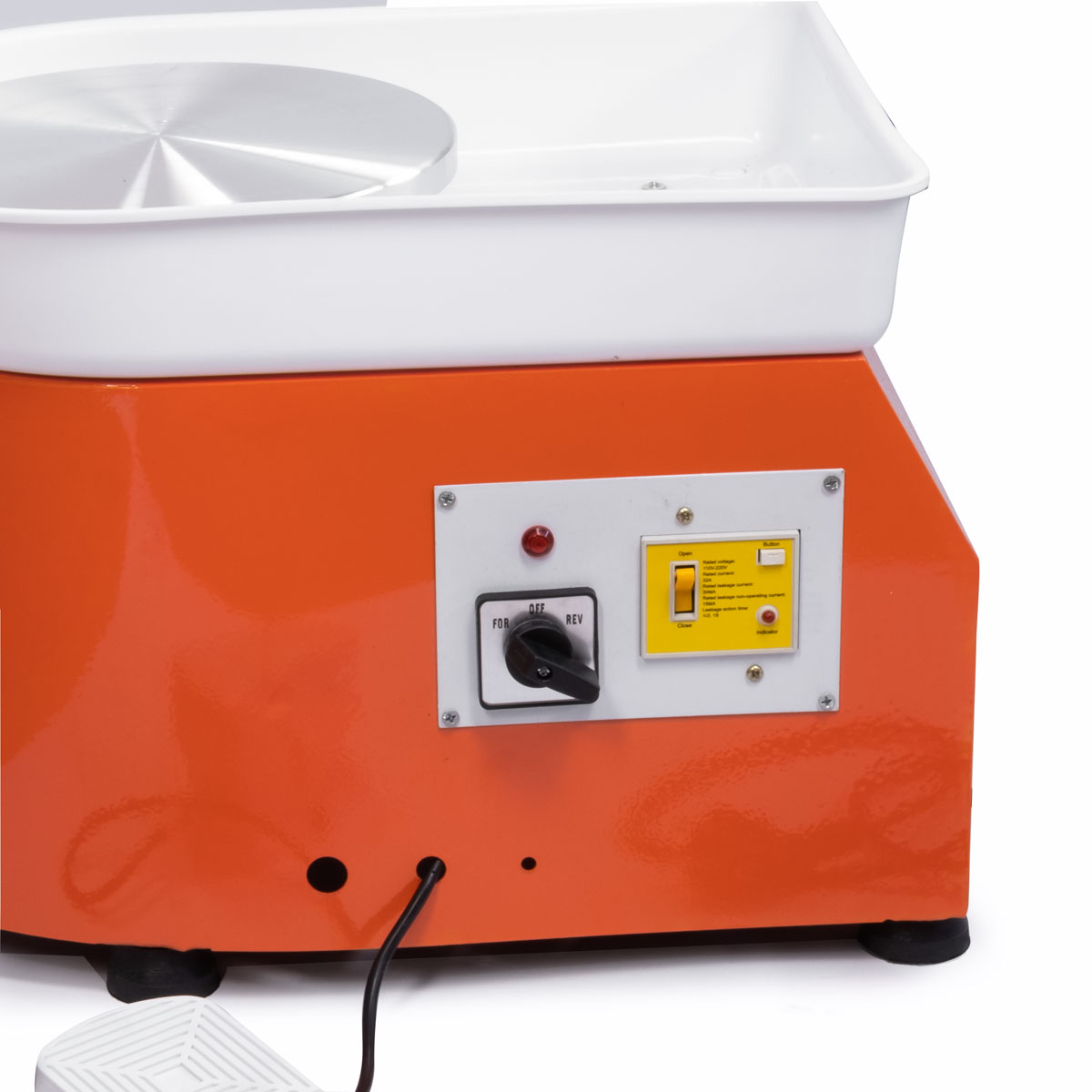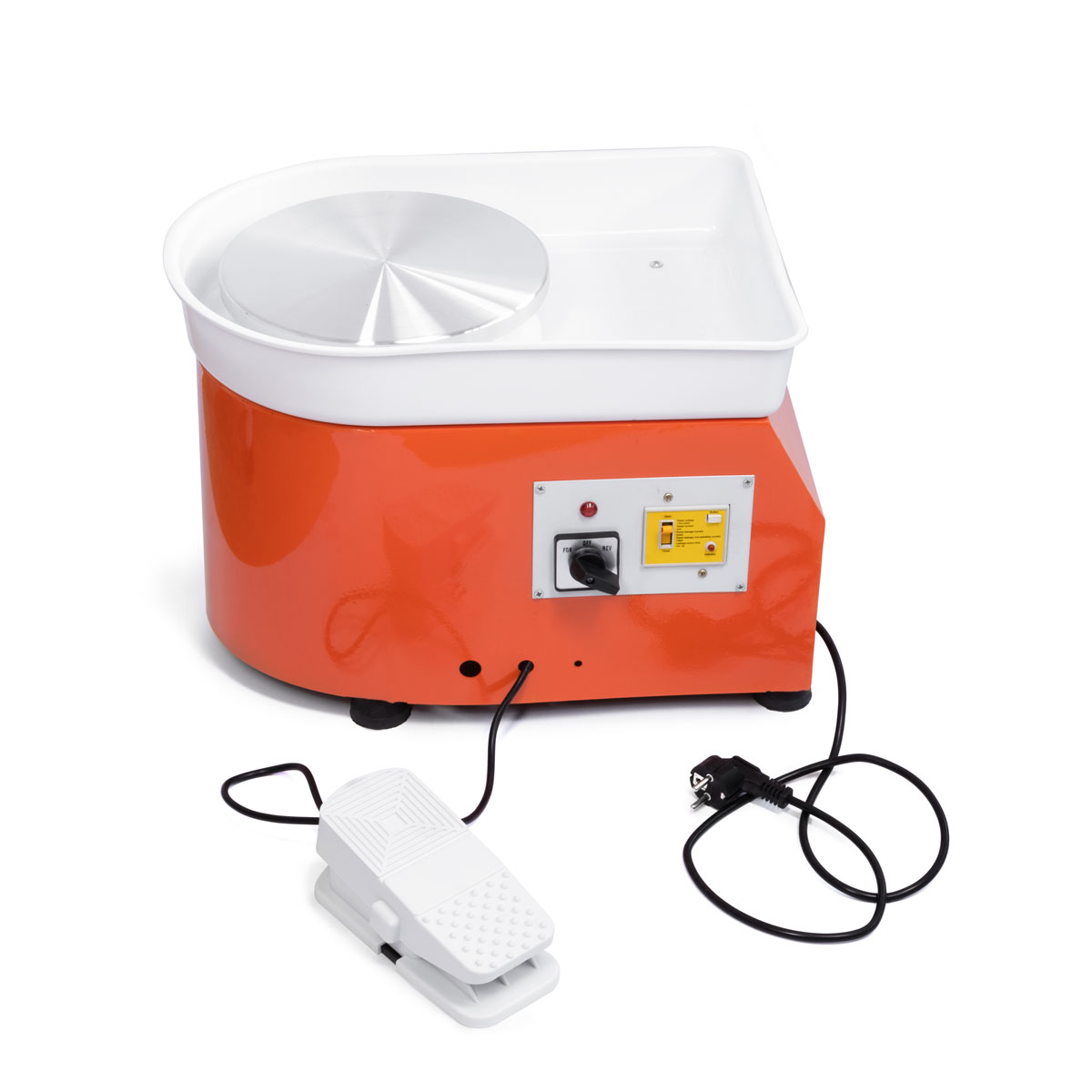 Koło garncarskie jest zasilane konwencjonalną energią elektryczną. Gniazdo 230V/50Hz. Na głównym panelu koła garncarskiego znajduje się pokrętło, które włącza i wybiera kierunek obrotów silnika, prędkość obrotowa silnika 0-300 obr / min jest kontrolowana za pomocą pedału nożnego. Pedał nożny jest bez sprężyny i pozostaje zablokowany w ustawionej pozycji, co pozwala na wciśnięcie pedału i zdjęcie stopy, a gramofon nadal utrzymuje ustawioną prędkość - (pedał działa jak kołyska, po wciśnięciu do przodu gramofon przyspiesza, a po wciśnięciu do tyłu zwalnia). Lakierowany stalowy stół jest stabilny i ma dużą nośność, cały system stoi na metalowych nogach, pod 25-centymetrowym gramofonem znajduje się jednoczęściowy, nieusuwalny zbiornik wykonany z twardego, gładkiego plastiku, który jest łatwy do czyszczenia.