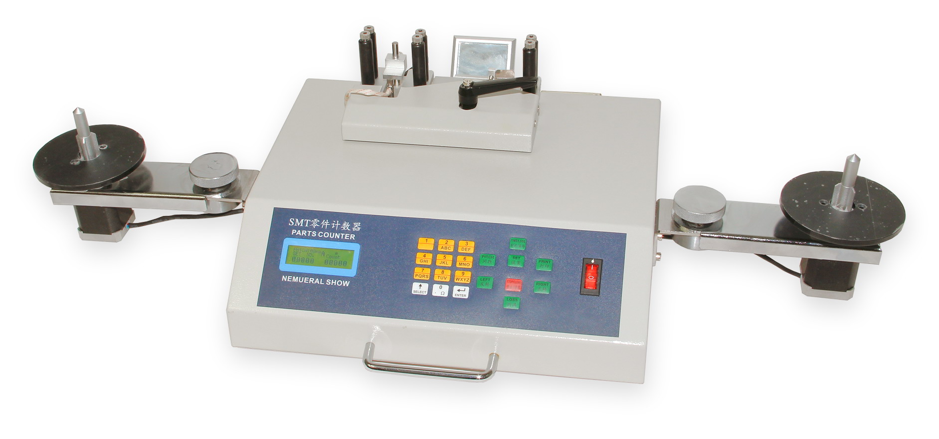Dwa trzpienie odwijające i nawijające obsługują rolki o średnicy od najmniejszej do największej - do 50 cm. Dwa ramiona z trzpieniami nawijającymi są obrotowe i można je ustawić w najbardziej odpowiedniej pozycji do odwijania wstęgi w zależności od średnicy szpuli. Rozruch silników podczas liczenia jest płynny, dzięki czemu taśma z komponentami jest jak najmniej obciążona mechanicznie. Prędkość jest równie płynnie zmniejszana, gdy zbliża się do ustawionej wartości odliczania komponentów. Rzeczywista jednostka licząca, przez którą automatycznie przeciągana jest perforowana taśma z chipami, obsługuje wszystkie używane szerokości blistrów z PVC i papieru. W celu prawidłowego ustawienia optycznego licznika brakujących części, wysokość wiązki laserowej bramki optycznej można regulować tak, aby wiązka przecinała środek części SMD na danej szerokości okna podglądu tacy taśmy.