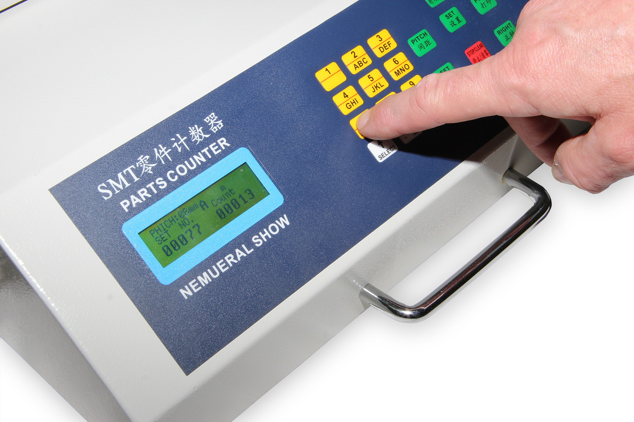 Automatyczny licznik części SMD z możliwością podłączenia czytnika kodów kreskowych i drukarki w celu odczytu nazwy liczonych części i późniejszego drukowania etykiet rejestracyjnych z nazwą części i liczbą sztuk. Licznik części SMT jest wyposażony w optyczną detekcję brakujących części w poszczególnych segmentach okienek blistra. Napęd silnikowy zapewnia przewijanie rolek po obu stronach zgodnie z poleceniami operatora. Urządzenie zliczające posiada tryby zliczania rosnącego i malejącego. Po zliczeniu określonej liczby części proces liczenia zatrzymuje się automatycznie.