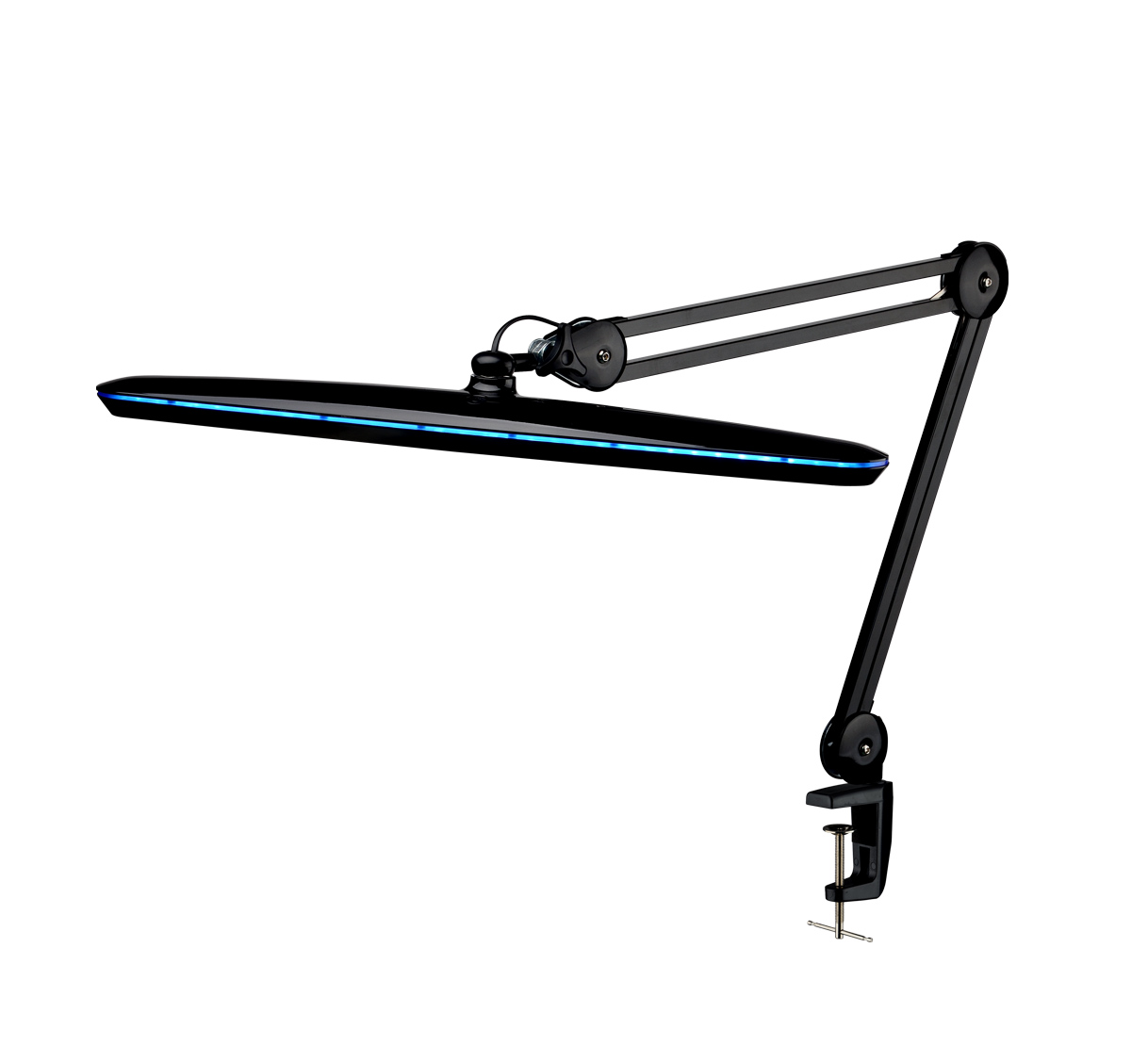 Głowica lampy ma wydłużony owalny kształt o długości 58 cm i szerokości zaledwie 9 cm, co wygląda bardzo elegancko i jednocześnie oszczędza miejsce. Za oświetlenie odpowiada 117 diod LED SMD, każda o mocy 0,2W i wysokim strumieniu świetlnym 2200 lumenów (więcej niż konwencjonalna żarówka 100W) przy zachowaniu rozsądnego poboru mocy na poziomie zaledwie 24W. Dzięki długości głowicy, lampa oświetla znaczną część blatu roboczego, ułatwiając serwisowanie pod nim. Ozdobna kolorowa linia na obwodzie głowicy lampy również przyciąga wzrok i sprawia eleganckie wrażenie. Lampa posiada również możliwość zmiany intensywności światła w 4 krokach - 25%, 50%, 75% i 100%. Po piątym naciśnięciu przycisku lampa wyłącza się. Temperatura barwowa lampy to 5600 - 6000K - chłodniejsza biel.