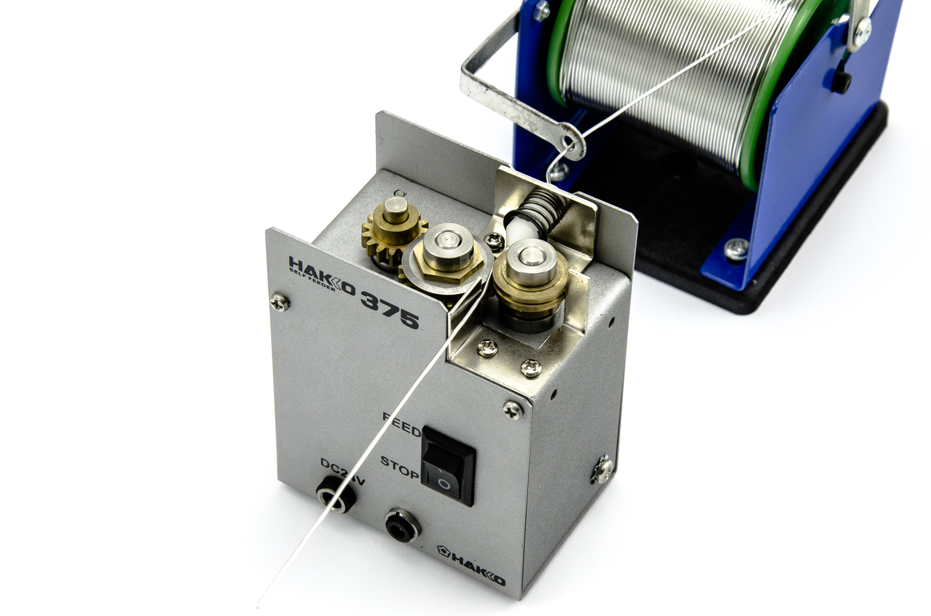 Podawanie cyny odbywa się za pomocą solidnej, całkowicie metalowej, zmotoryzowanej przekładni z kołami zębatymi, która sama odwija cynę ze zwoju. Cewka z cyną musi być umieszczona na stojaku odwijającym, który nie jest dołączony do produktu.