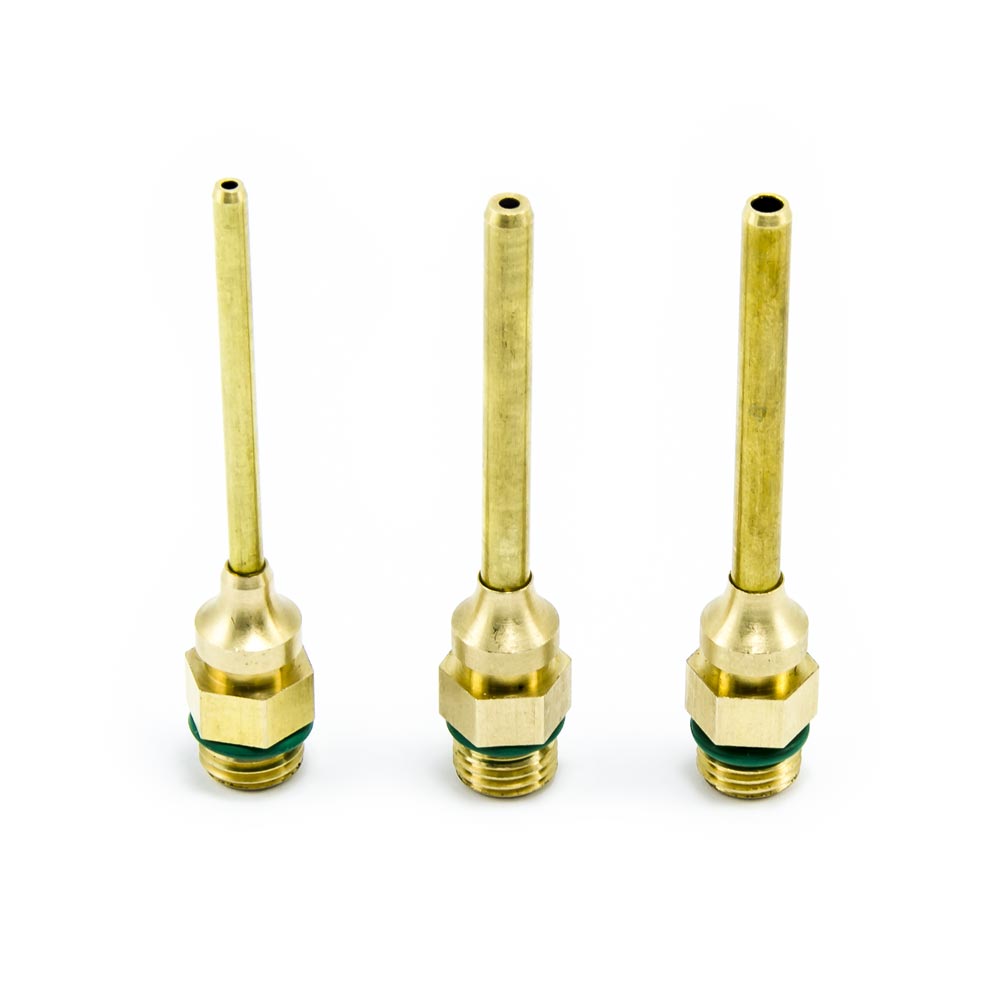 Zestaw długich mosiężnych dysz rurowych o różnych średnicach do wszystkich pistoletów do klejenia na gorąco z odkręcaną dyszą o średnicy gwintu 10 mm (najpopularniejszy typ).