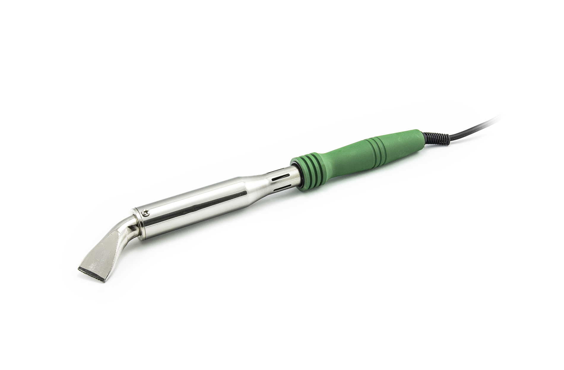 Jest to najmocniejsza lutownica w naszym asortymencie, o dużej mocy 300 W, odpowiednia do lutowania masywnych metalowych przedmiotów, które mają tendencję do odbierania ciepła z grotu i dlatego są nielutowalne dla konwencjonalnych lutownic. Końcówka mikrolutownicy jest wykonana z dużego litego drewna (300 g) o średnicy 18 mm, więc po podgrzaniu ma dobrą bezwładność cieplną, a lutowanie dużych metalowych przedmiotów jest łatwe. Końcówka jest wygięta pod kątem 30° i ma spłaszczony koniec o szerokości 25 mm. Niklowany grot jest łatwo wymienialny i jest utrzymywany w lutownicy za pomocą śrub krzyżakowych. Lutownica jest nieregulowana i nagrzewa się do pełnej mocy po włączeniu.