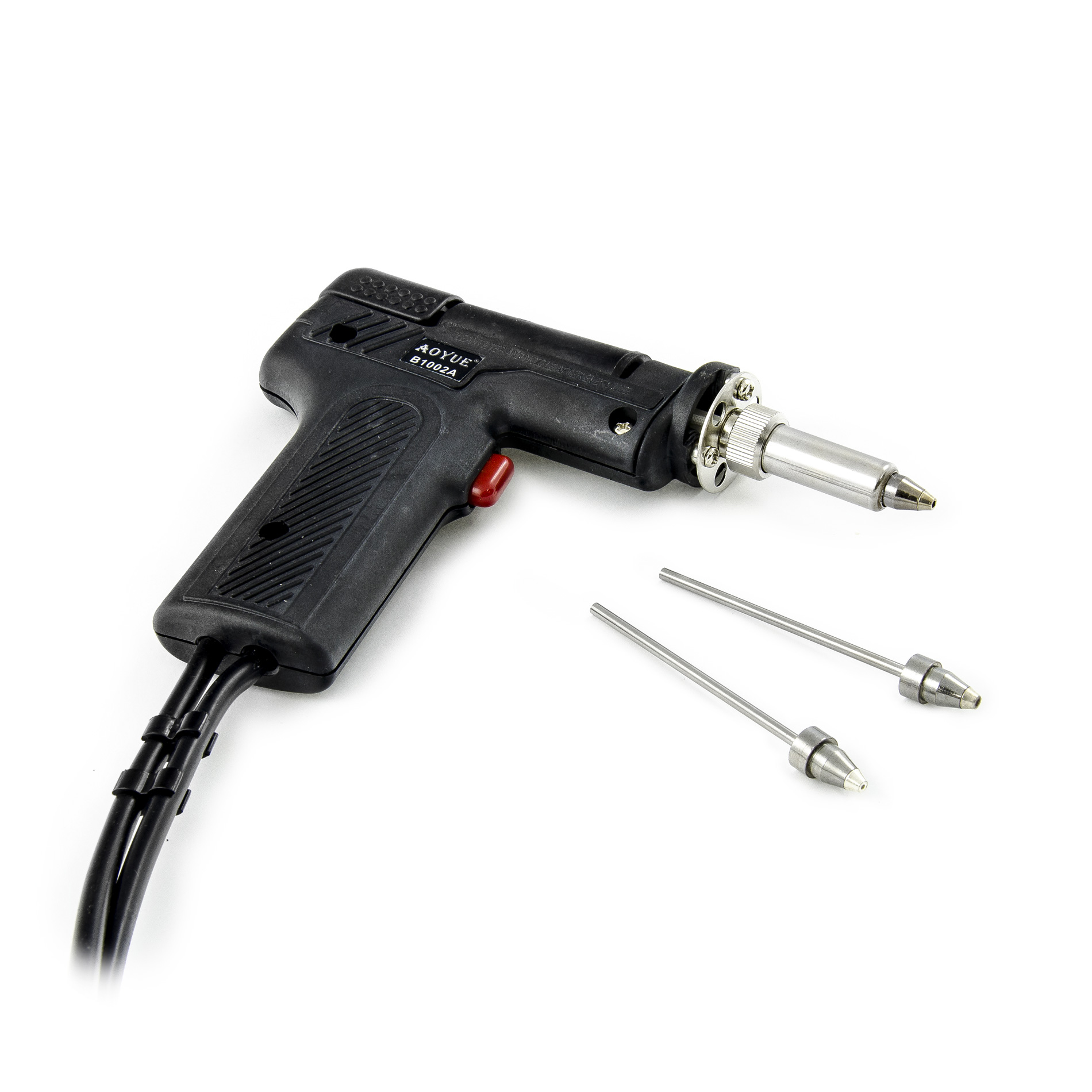 Pistolet do rozlutowywania Aoyue B1002A umożliwia wymianę końcówek - wykorzystuje końcówki DES-02. W zestawie znajdują się trzy końcówki - 1,8 mm (dołączona do pistoletu), 1,5 mm i 1 mm oraz zestaw do ich czyszczenia.