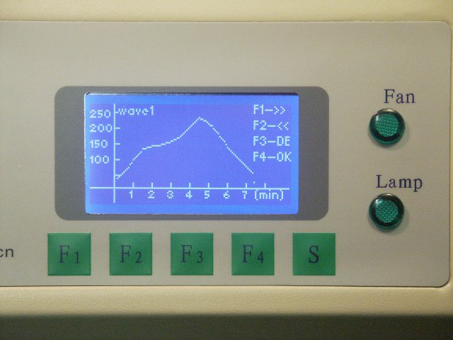 W zależności od użytego stopu lutowniczego, użytkownik ustawia krzywą lutowania, a system procesora automatycznie kontroluje cały proces. Do wyboru jest 8 zdefiniowanych krzywych temperatury, a temperaturę krzywych 7 i 8 można zmieniać w zakresie od 0 do 280°C w każdym punkcie czasowym 0-8 min. Wykorzystuje promieniowanie IR do ogrzewania lub kombinację z przepływem gorącego powietrza. Wentylatory są używane do realizacji fazy chłodzenia.