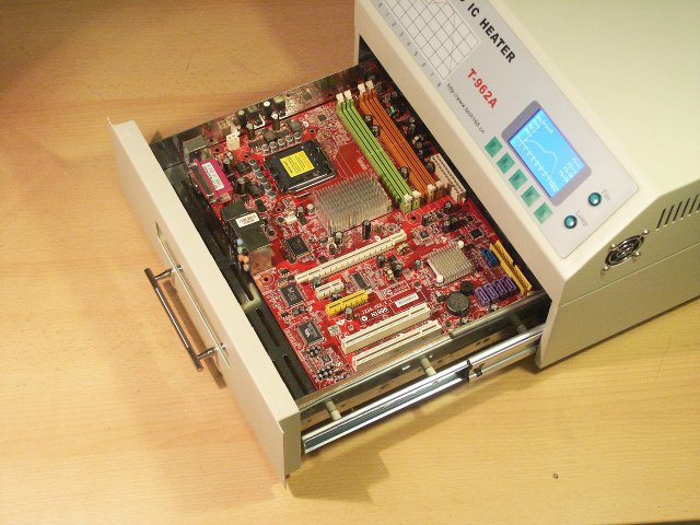 Technologia lutowania piecowego ma ogólne zastosowanie do lutowania komponentów SMT i SMD. Odpowiednim urządzeniem do takiego lutowania jest tak zwany piec ciągły lub piec tunelowy. Piece te mają kilka pasów temperaturowych, przez które płytka PCB jest przenoszona za pomocą tacy taśmowej. Prędkość, z jaką płytka przemieszcza się przez poszczególne strefy temperaturowe, określa długość czasu, przez jaki płytka PCB pozostaje w strefach temperaturowych i zapewnia niezbędny przebieg temperatury procesu lutowania, w tym zalecane chłodzenie końcowe na końcu procesu, które jest realizowane przez wentylatory. Takie piece są jednak bardzo duże, niepotrzebnie solidne i mogą być bardziej skomplikowane w obsłudze; oczywiście lepiej nadają się do dużych ilości PCB. T-962A nie jest piecem ciągłym i dlatego nie ma ruchu płytki w piecu; wyeliminowano potrzebę ogrzewania kilku stref i potrzebę przenoszenia płytki za pomocą przenośnika. Precyzyjny pomiar czasu i temperatury zapewniają grzejniki iR - ogniwa kwarcowe i wentylatory nad płytką PCB, wraz z czujnikami temperatury i jednostką sterującą procesora. Gwarantuje to, że obwiednia temperatury jest utrzymywana przez cały proces lutowania, w tym chłodzenie końcowe, bez ruchu płytki.