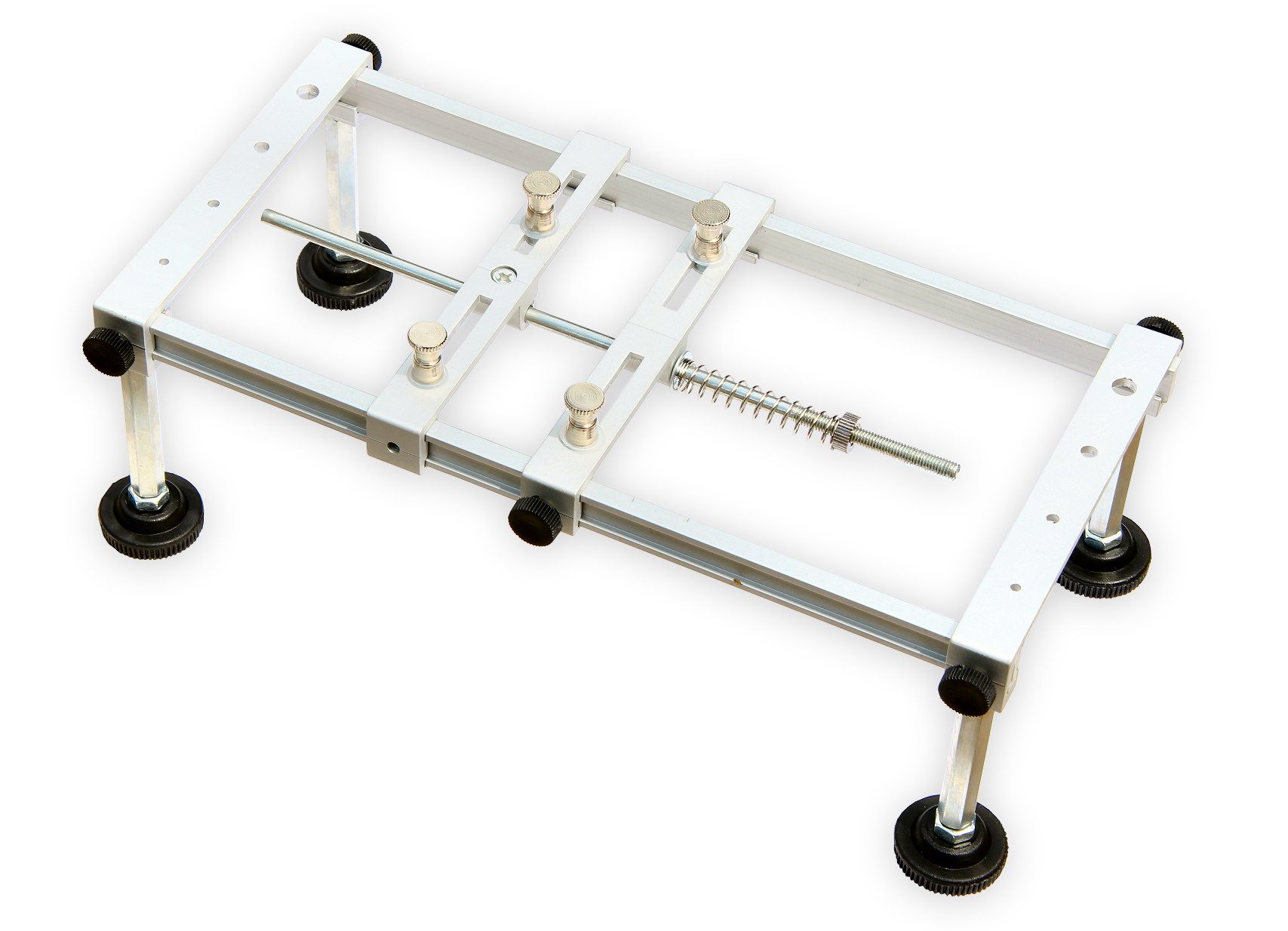 Uniwersalny uchwyt PCB do płyt bazowych mniejszych urządzeń, zwłaszcza elektroniki przenośnej. Umożliwia proste mocowanie płytek PCB o szerokości do 195 mm. Rozstaw mocowań na ruchomych szynach jest regulowany w zakresie 25-85 mm. Wysokość stołu można regulować poprzez przykręcenie nóżek w zakresie od ok. 70 do 105 mm nad płytą bazową.