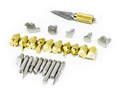 Zestaw 28szt końcówek do wypalania i lutowania do piór i stacji pirograficznych. Zestaw zawiera 15 sztuk końcówek do wypalania i rysowania w drewnie, skórze lub plastiku z gwintem zewnętrznym M4, 10 sztuk końcówek do lutowania z gwintem M4, 1 sztukę noża tnącego i 2 sztuki teflonowych szablonów z literami i znakami. Zestaw jest przeznaczony do wszystkich typów piór pirograficznych z gwintem wewnętrznym M4 Kompatybilne pióra i stacje pirograficzne: Lutownica do drewna, skóry i korka, 30 W, 14 grotów Lutownica do drewna, skóry i korka, 30 W, 26 końcówek Kombinowana stacja lutownicza i pirograficzna YIHUA 939D II 2w1 z dużym zestawem grotów Pakowana w blister.