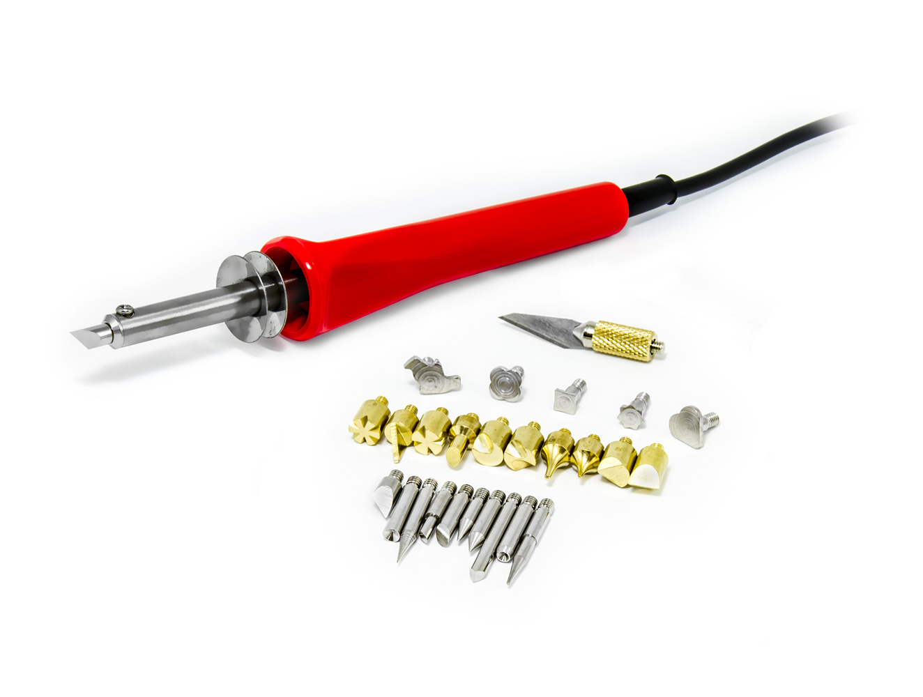 W zestawie znajduje się mikrolutownica pirograficzna z gwintowanym mocowaniem końcówki, 26 wymiennych końcówek przeznaczonych do pisania, malowania i wypalania dołączonych wzorów. W zestawie znajduje się również specjalna końcówka z uchwytem na ostrze skalpela, która może być używana do rzeźbienia na gorąco. W zestawie znajdują się również klasyczne końcówki do mikrolutowania, którymi oprócz wypalania można okazjonalnie lutować elektronikę. Do lutowania elektroniki zalecamy jednak wybór mocniejszych wersji lutownic przeznaczonych specjalnie do tego celu. W zestawie znajdują się również dwa plastikowe szablony z literami, cyframi i podstawowymi znakami do wstępnego narysowania tekstu do wypalenia (ołówkiem)