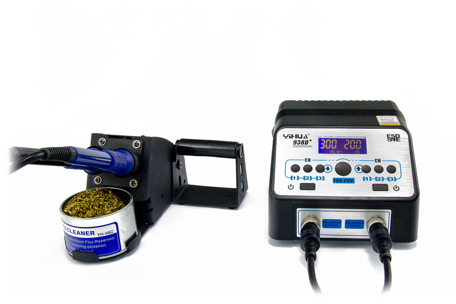 Podwójna antystatyczna stacja lutownicza z niezależnym sterowaniem grotami lutowniczymi. Para mikrolutownic może być używana przez dwóch operatorów lub jednego technika serwisowego przy użyciu