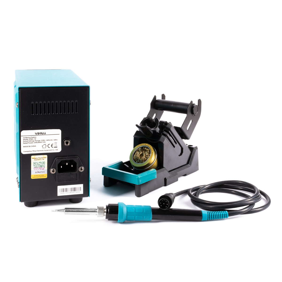 Cyfrowa stacja lutownicza YIHUA 939D+IV ESD z wejściem mocy 90 W do lutowania kontaktowego i bezołowiowego oraz rozlutowywania komponentów i obwodów SMD lub THT za pomocą pióra lutowniczego z wymiennym grotem ze zintegrowanym sprzężeniem zwrotnym do precyzyjnej kontroli temperatury. Stacja oferuje wystarczającą moc do normalnego lutowania komponentów, ale także do lutowania i cynowania większych styków złączy lub cynowania przewodów o większej średnicy. Dzięki cyfrowej kontroli temperatury ze sprzężeniem zwrotnym i wysokiej mocy wejściowej stacji, nagrzewanie grotu jest szybkie, a ustawienie temperatury jest bardzo precyzyjne. Stacja lutownicza jest integralną częścią każdego domowego lub profesjonalnego warsztatu.