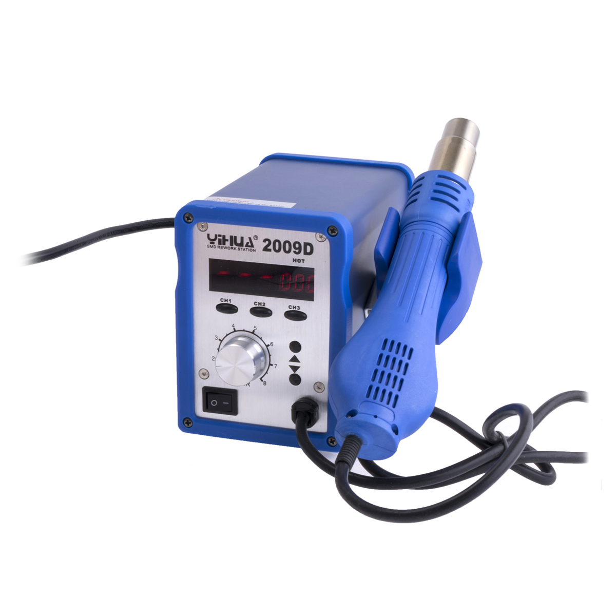 Stacja została zaprojektowana tak, aby nie zajmowała więcej miejsca na biurku niż jest to konieczne. Oszczędność miejsca wynika głównie z braku kompresora wewnątrz stacji. Zamiast tego zastosowano turbo dmuchawę bezpośrednio w uchwycie. Praca turbiny jest cicha, zwłaszcza przy maksymalnej prędkości, poziom hałasu jest niższy niż w przypadku porównywalnych systemów gorącego powietrza wyposażonych w turbodmuchawę. Ponadto wydajność turbosprężarki jest wyższa w porównaniu do sprężarek membranowych, zapewniając przepływ do 60 litrów powietrza na minutę. OSTRZEŻENIE - oferty innych producentów podają dwukrotnie większe natężenie przepływu, co w praktyce jest nierealne, a dmuchawa tej stacji nie jest w stanie osiągnąć takich wartości. Maksymalna prędkość turbiny zapewnia natężenie przepływu wynoszące około 60 litrów na minutę i to przy założeniu, że na rurze nie jest zamontowany żaden element mocujący. Jeśli zwiększona wydajność dmuchawy jest niezbędna dla danego zastosowania, będzie ona dostępna w połączeniu z przystawkami o największej możliwej powierzchni kryzy (zazwyczaj przystawki BGA). W przypadku korzystania z wąskich dysz, dozowana objętość powietrza jest porównywalna ze stacjami wyposażonymi w pompę membranową. Należy jednak zwrócić uwagę na koniec metalowej rurki; ten typ nie pozwala na użycie naszej szerokiej gamy przystawek. Ze względu na różną średnicę wylotu rurki, zakres jest ograniczony do trzech średnic dostarczanych nasadek, a mianowicie 5 mm, 7 mm i 12 mm. Średnice te obejmują jednak praktycznie wszystkie operacje przeróbki małych i średnich układów BGA. Jeśli jednak zamierzasz używać określonych typów rozszerzeń, musisz wybrać inną stację.