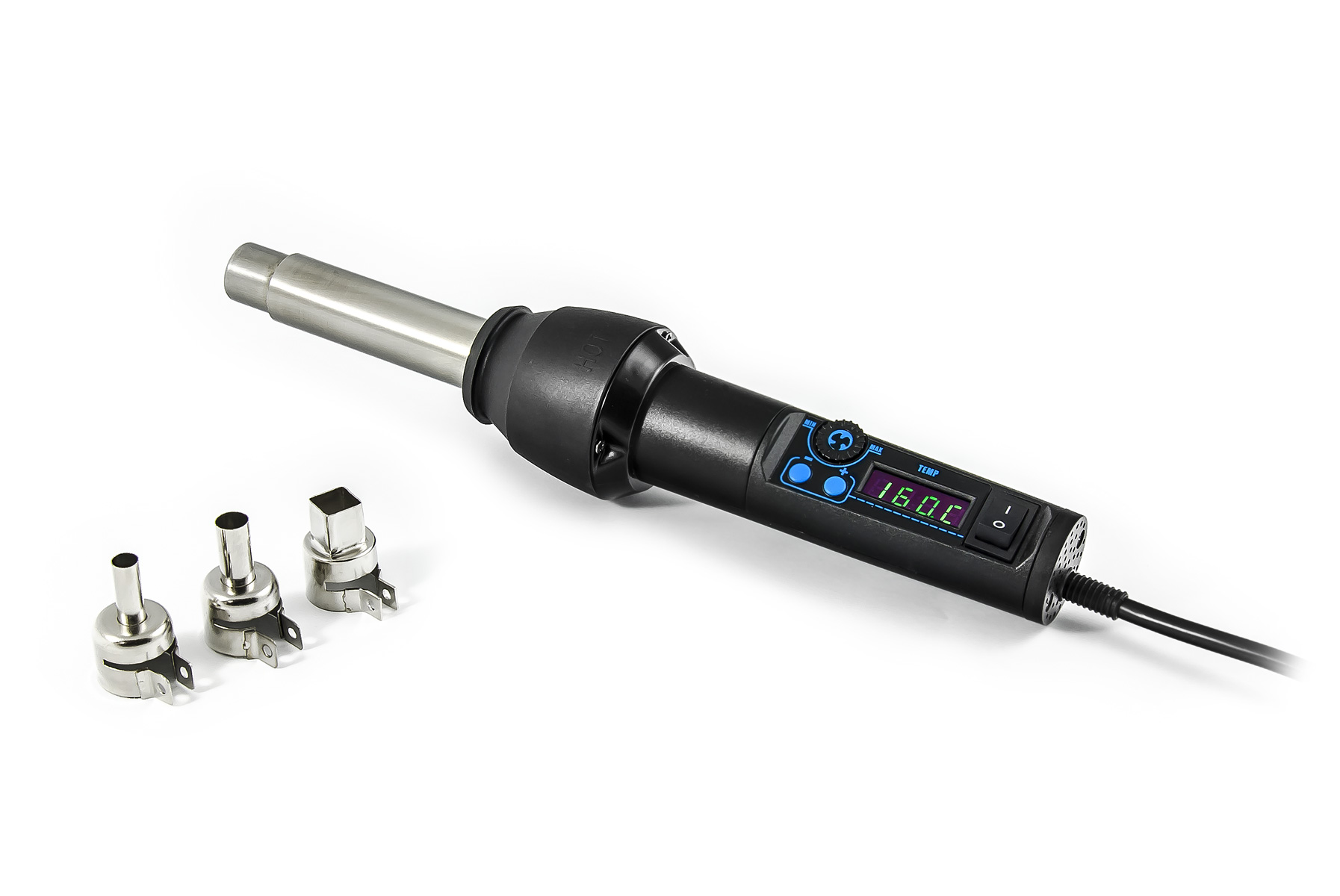 Yihua 8858-I to kompaktowy pistolet na gorące powietrze z wydajną pompą z płynną regulacją - do 60 l/min. Temperatura powietrza jest regulowana cyfrowo za pomocą dwóch przycisków w zakresie od 100°C do 480°C. Regulacja temperatury jest bardzo precyzyjna. Ustawioną i aktualną temperaturę można monitorować na czterocyfrowym zielonym wyświetlaczu LED. Na wyświetlaczu znajduje się również wskaźnik LED wskazujący podłączenie do sieci. Yihua 8858-I posiada również przełącznik kołyskowy w rękojeści, który odłącza element grzejny po wyłączeniu i schładza go do 100°C z przesunięciem, w którym to momencie lutownica zostaje wyłączona.