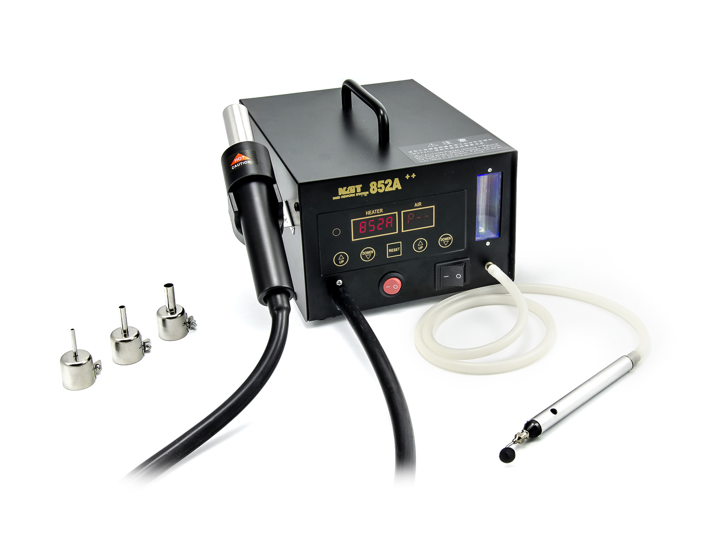 W pełni cyfrowy system lutowania gorącym powietrzem z pincetą próżniową. System lutowniczy zbudowany jest w oparciu o obudowę stacji 852A+, a dodatkowo posiada kompresor ssący z silikonowym przewodem oraz przyssawkę do podciśnieniowego chwytania elementów SMT. Funkcja pęsety jest obsługiwana przez zamknięcie palcem kontrolnego otworu ssącego na rękojeści. Wszystkie ustawienia stacji lutowniczej są dokonywane za pomocą przycisków, a bieżące wartości pomiarowe są wyświetlane na wyświetlaczach LED.