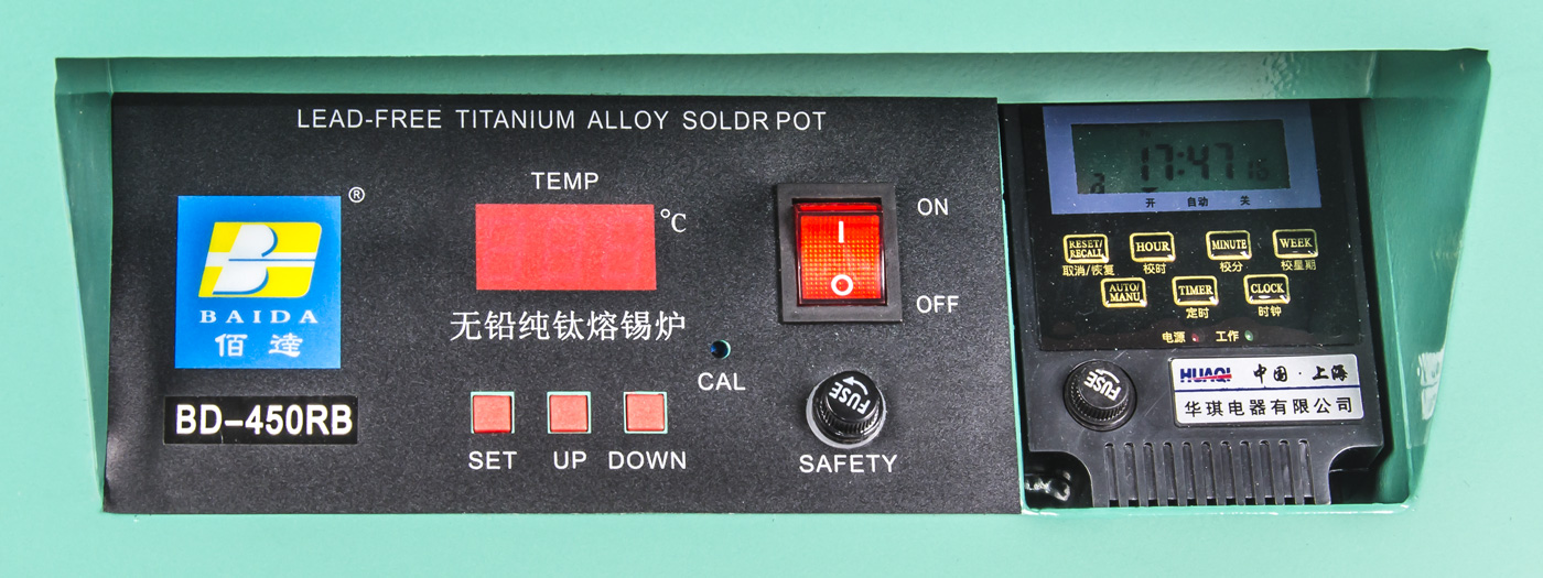 Wanna do cynowania BD-450RB to mobilna jednostka z tytanową wanną o wymiarach wewnętrznych 450x300x50 mm, zaprojektowana do 49 kg stopu cyny i ogromnej powierzchni cynowania. Ustawienie temperatury jest całkowicie standardowe, jak w przypadku wszystkich serii BD - cyfrowe z wyświetlaczem pokazującym aktualną temperaturę stopionego stopu. Zaawansowany timer jest również dołączony do tej wanny do cynowania. Kształt wanny do cynowania jest korzystny pod względem wymiarów w niektórych zastosowaniach, takich jak zastępowanie wełny cynowej do lutowania małych partii lub opracowywanie elementów PCB do rozmiaru określonego przez wymiary wanny. Korpus wanny wykonany jest ze stopu tytanu, dzięki czemu jest bardziej odporny na erozję przy długotrwałym użytkowaniu. Wanny te są znacznie trwalsze niż te wykonane ze stali nierdzewnej. Ponadto stop tytanu, z którego są wykonane, pozwala na znacznie wyższe temperatury pracy niż w przypadku wanien ze stali nierdzewnej, do 600°C w przeciwieństwie do maksymalnie 480°C w przypadku stali nierdzewnej.