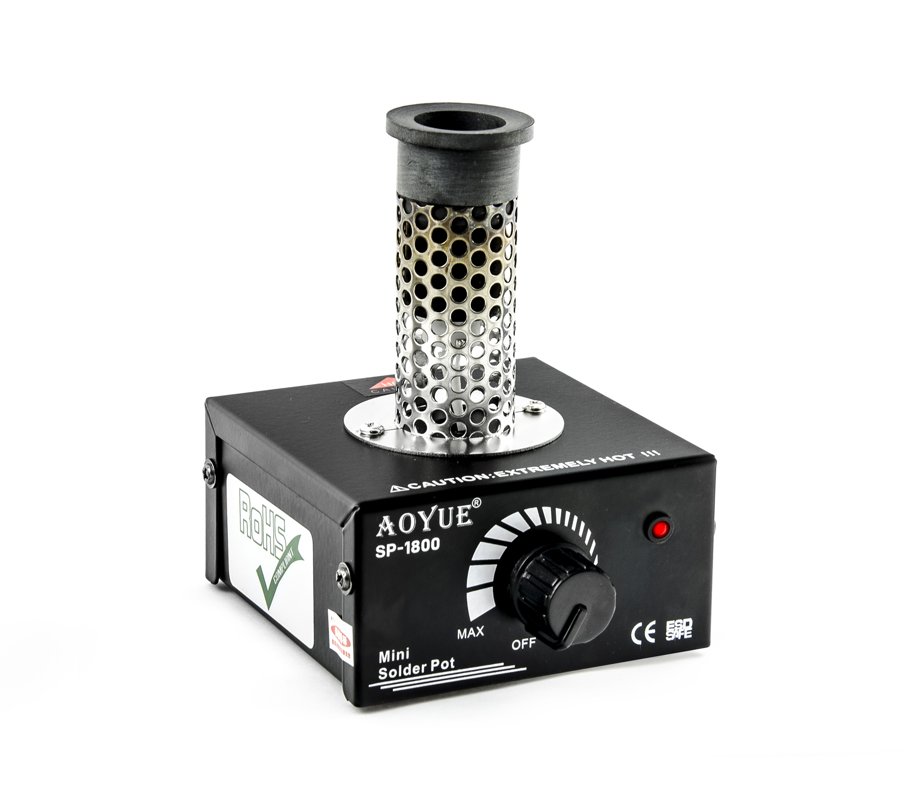 Wanna do cynowania AOYUE SP1800 to uniwersalna wanna do cynowania przeznaczona do użytku stacjonarnego z lutowiem ołowiowym lub bezołowiowym. Wanna wyposażona jest w mocny ceramiczny element grzewczy, który szybko nagrzewa i topi lut. Temperatura kąpieli SP1800 może być regulowana za pomocą potencjometru obrotowego w zakresie od