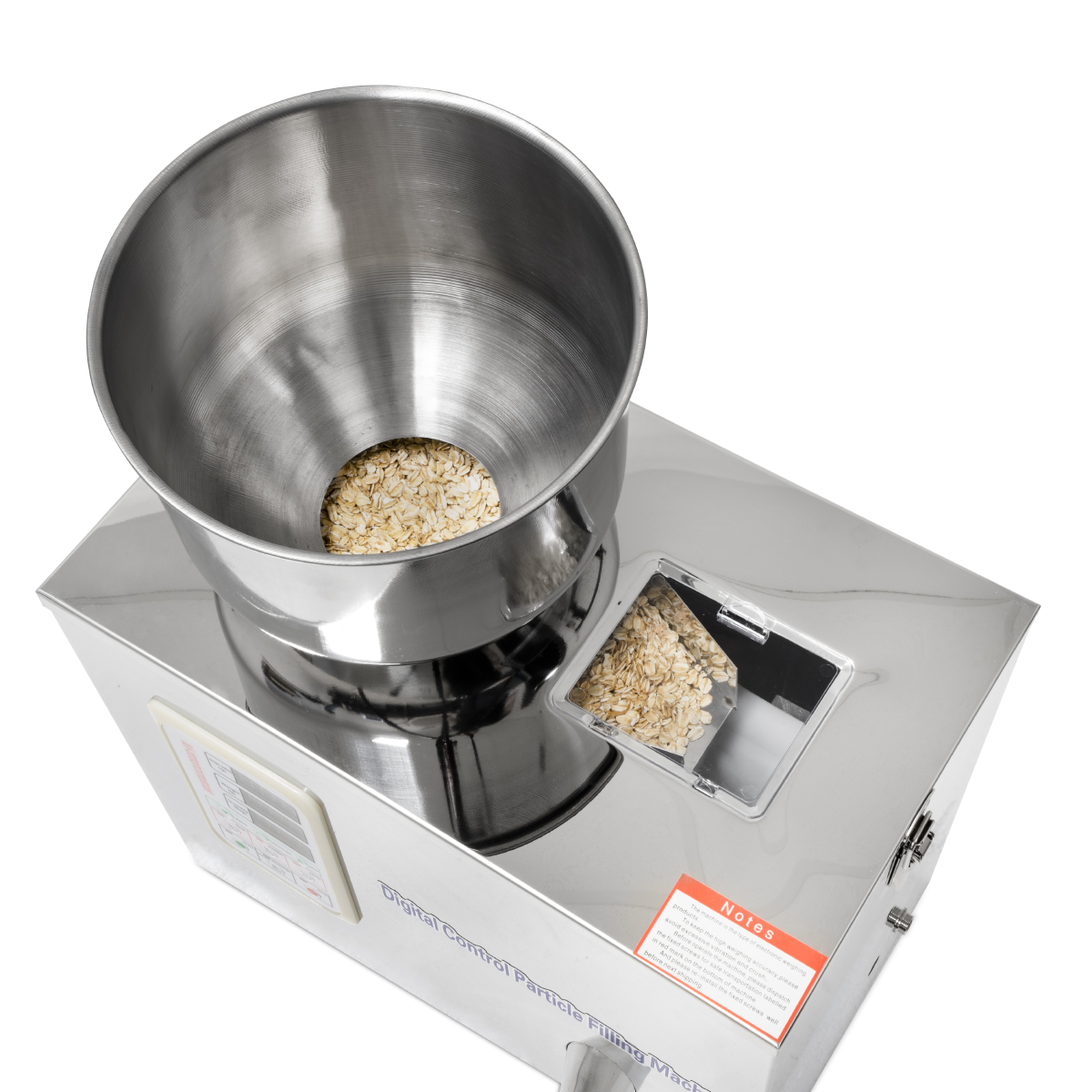 Całe sterowanie dozownikiem odbywa się za pomocą jednostki głównej z przodu urządzenia, gdzie można ustawić wagę dawki w zakresie 2g - 25g oraz prędkość dozowania w trzech stopniach. Dozownik posiada również licznik do wyraźnego wyświetlania liczby dawek, wyświetlacz jest obsługiwany przez segmentowy wyświetlacz, który jest łatwy do odczytania nawet w bardzo słabych warunkach oświetleniowych. Dozownik działa na zasadzie wibracji, wewnątrz znajduje się miska ze spiralną ścieżką, która prowadzi do leja ważącego. Jest on zamknięty, dopóki jednostka sterująca nie zważy ustawionej ilości. Ważenie jest bardzo precyzyjne, jednostka dostosowuje intensywność wibracji i wybiera łagodniejszą pod koniec, aby uzyskać jak najdokładniejszą wagę. Dozownik dozuje z bardzo małym odchyleniem - tylko 1%. Odchylenie końcowego ważenia ma bezpośredni związek z grubością ważonego materiału.