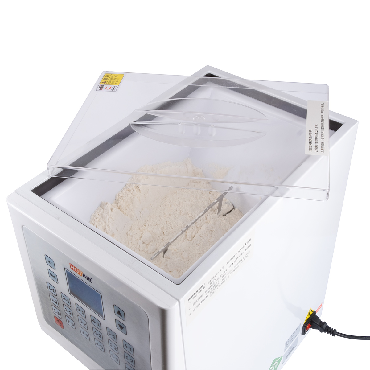 Dozownik Xoleo jest wykończony w kolorze białym, a prosty system sterowania zapewnia płynną i łatwą obsługę. Wyświetlacz i klawiatura znajdują się na przednim panelu. Podświetlany na niebiesko wyświetlacz z białymi znakami pokazuje ustawioną wagę partii i służy również do regulacji prędkości ślimaka. Poniżej wyświetlacza znajduje się klawiatura z przyciskami do włączania i regulacji prędkości ślimaka (pojedyncza wielkość wsadu). Oprócz przycisków konfiguracji i zasilania, na klawiaturze znajdują się dodatkowe przyciski do zmiany wielkości wsadu, dzięki czemu wielkość wsadu można zmieniać stopniowo bez ciągłego dostosowywania prędkości ślimaka. Przyciski zmieniają czas dozowania lub liczbę obrotów ślimaka, więc jeśli na przykład pierwszy jest ustawiony na 5 g, to ostatni będzie wynosił 100 g w zależności od ustawionej liczby obrotów i gęstości materiału. Poniżej klawiatury znajduje się wylot ślimaka ze stali nierdzewnej o średnicy 35 mm, z którego materiał spada do wcześniej przygotowanego pojemnika. Zbiornik na materiały sypkie ma pojemność 3,5L i jest wyposażony w łopatki, które mieszają materiał sypki podczas obracania się ślimaka, a przezroczysta górna pokrywa służy nie tylko jako element bezpieczeństwa, ale także zapobiega niepotrzebnemu pyleniu materiału do otoczenia.