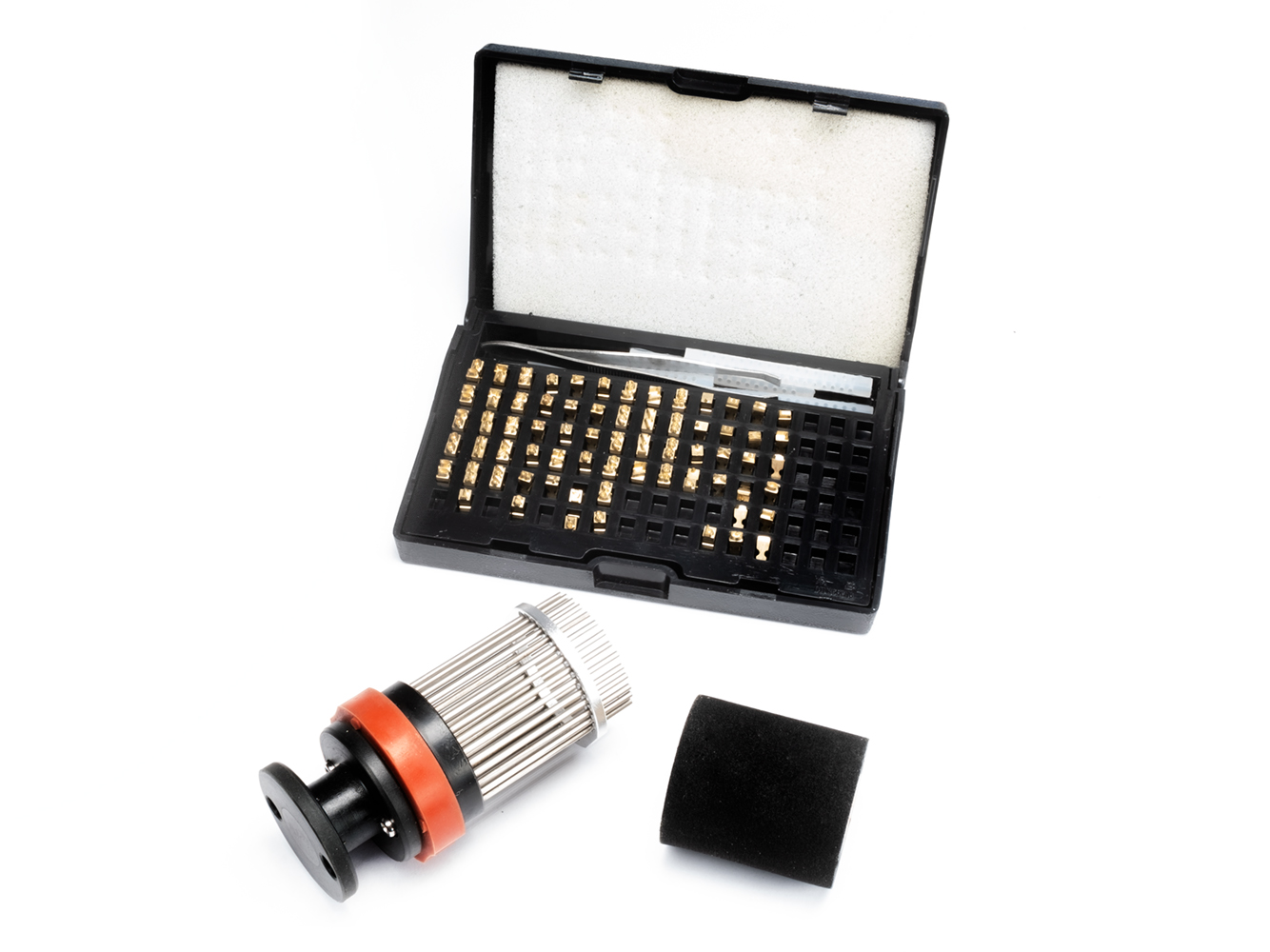 Zawartość opakowania: drukarka z materiałem montażowym i jednostką sterującą, głowica drukująca, wałek z tuszem, zestaw znaków z pęsetą.