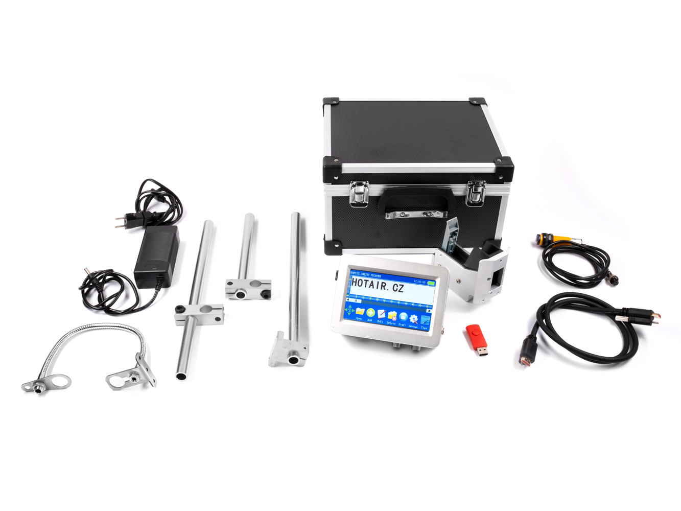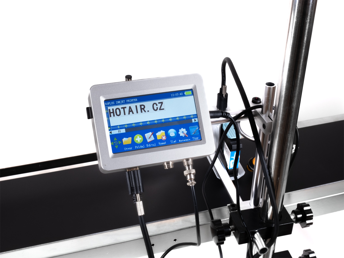 Drukarka składa się z jednostki sterującej w aluminiowej obudowie z dużym ekranem dotykowym, za pomocą którego można wprowadzać tekst, tworzyć kody kreskowe, ustawiać rozmiar czcionki, zmieniać czcionkę lub styl czcionki (Itlaic, Blood). Do drukarki można również przesyłać obrazy BMP i pliki .txt za pośrednictwem złącza USB i dołączonej pamięci flash USB. Drukarka drukuje jeden wiersz na raz, do którego można wstawić tekst (jeden wiersz maks. 160 znaków), kod kreskowy, logo, datę lub numer seryjny z automatycznym dodawaniem.drukarka obsługuje zestawy znaków dla łącznie 21 języków, w tym angielskiego i słowackiego (nie pozwala jeszcze na wprowadzanie czeskich znaków diakrytycznych). 21 czcionek jest domyślnie załadowanych do drukarki i można dodać niestandardowe czcionki. Głowica drukująca jest podłączona do jednostki sterującej z wyświetlaczem za pomocą kabla HDMI.
