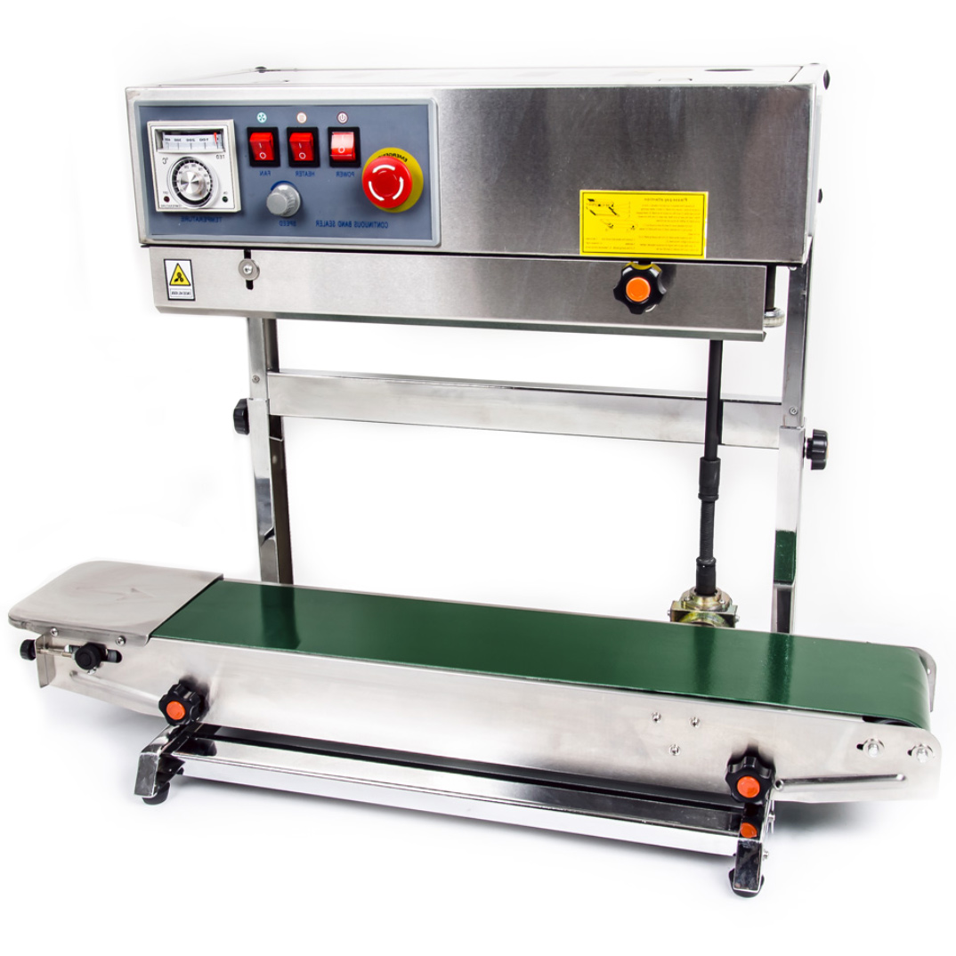 Zgrzewarka ciągła do worków, woreczków i folii z własnym przenośnikiem i nadrukiem (wytłaczaniem) partii do zgrzewu DBF-770. W porównaniu do zgrzewarek ręcznych, ta dwustronna zgrzewarka ciągła jest przeznaczona do operacji zgrzewania o dużej objętości i tempie. Ze względu na dużą ilość zgrzewanych pakietów, pozwala ona zaoszczędzić znaczne koszty operacyjne. Jej rozmiar i konstrukcja sprawiają, że zgrzewarka nadaje się do krótkich i szerokich worków z materiałów PE, PP, PVC i Alu. Dzięki dwustronnemu zgrzewaniu może również zgrzewać grubsze worki oraz torebki z kawą i herbatą. Samo zgrzewanie w zgrzewarce ciągłej jest bardzo szybkie i w pełni automatyczne. Po podgrzaniu elementu grzejnego do żądanej temperatury, operator po prostu wkłada krawędzie opakowania do przekładni, która następnie przejmuje pakowanie. Następnie przenośnik transportuje gotowe opakowanie do końca przenośnika taśmowego, gdzie zgrzane opakowanie może spaść do pudełka lub przejść do następnego przenośnika. Zgrzewarka ciągła DBF-770 składa się z dwóch taśm i trzech podstawowych bloków. Pasy zgrzewające są wykonane z taśmy z włókna teflonowego. Przechodzą one przez element grzewczy, który topi folię. Taśma teflonowa zapobiega przywieraniu stopionej folii. Kolejnym blokiem jest element chłodzony powietrzem, który chłodzi i utwardza spoinę, dzięki czemu nie rozrywa się ona po opuszczeniu przenośnika. Ostatnią częścią przenośnika jest radełkowany stempel, który tworzy drobne wgłębienia, aby spoina była jeszcze mocniejsza. Wzorzysty stempel można zastąpić stemplem wsadowym - drukarką. Spawarka DBF-770 może wytłaczać informacje numeryczne na wybranej spoinie. W okrągłym stemplu znajdują się otwory - trzy segmenty po 15 znaków, do których ręcznie wprowadzane są poszczególne znaki. Szerokość powstałego zgrzewu wynosi 11 mm. Zgrzewarka do folii ciągłej DBF-770 jest bardzo prosta w obsłudze. Panel sterowania zawiera trzy przełączniki - włączanie/wyłączanie zasilania, włączanie elementu grzejnego i włączanie wentylatora bloku chłodzącego. Potencjometr obrotowy służy do wyboru prędkości przenośnika i taśmy podającej. Ostatnim elementem jest regulator temperatury (termostat) z wyświetlaczem aktualnej temperatury. Zakres temperatur tej spawarki do pracy ciągłej wynosi od 0 do 400°C. Temperatura musi być dopasowana do całkowitej prędkości podajnika i zgrzewanej folii. Zgrzewarka jest wyposażona w gumowy przenośnik taśmowy o szerokości 135 mm i aktywnej długości 68 cm. Przenośnik można odsunąć o 6 cm od zgrzewarki w celu zgrzewania dłuższych pakietów. Przenośnik posiada korekcję taśmy (rolki). Całe urządzenie zostało zaprojektowane specjalnie z myślą o dużym obciążeniu pracą, wszędzie tam, gdzie istnieje potrzeba zgrzania dużej liczby opakowań, co zajęłoby kilkakrotnie więcej czasu przy użyciu klasycznej zgrzewarki dźwigniowej. Nadaje się do pakowania żywności i innych towarów. Zawartość opakowania, DBF-770, zestaw listów, prowadnica worka