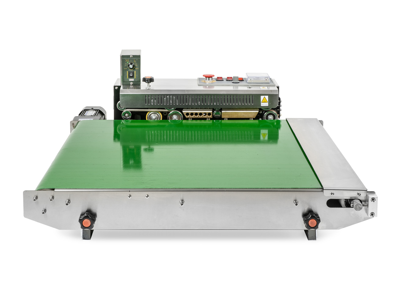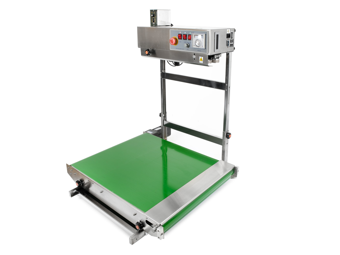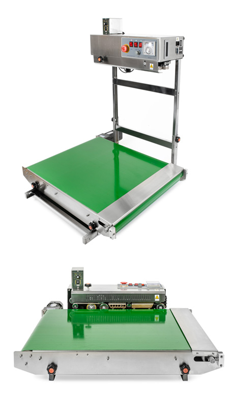 Ciągła zgrzewarka do folii DBF-770WL-600 z przenośnikiem taśmowym o szerokości 600 mm i udźwigu do 50 kg do zgrzewania dużych worków i opakowań z możliwością nadruku (wytłoczenia) partii w zgrzewie kontynuacja tekstu
