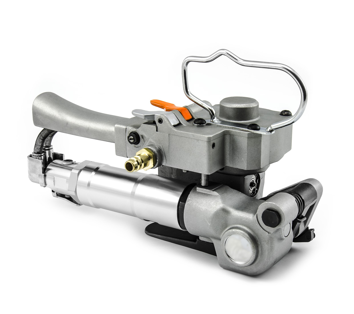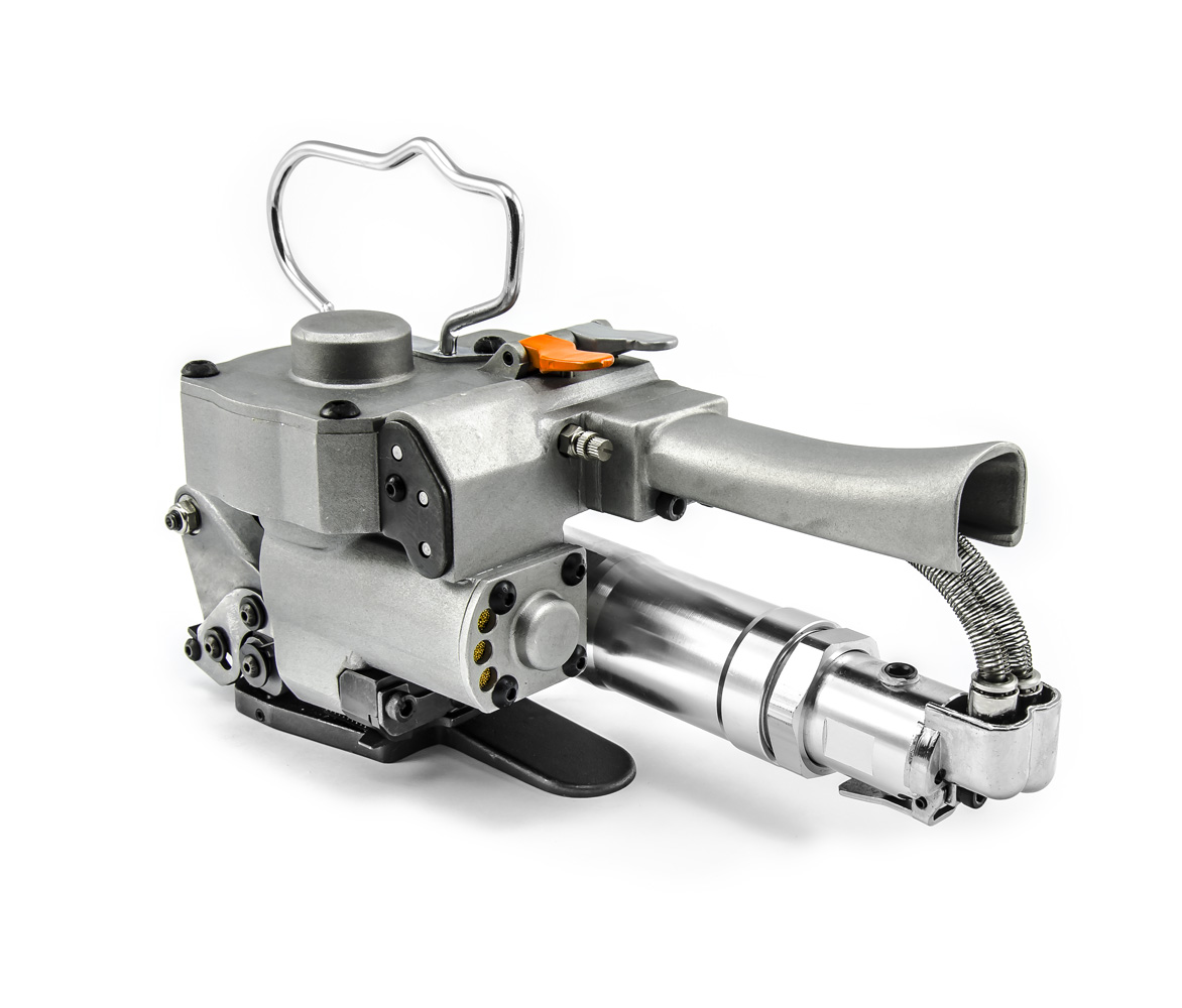 Wydajna pneumatyczna wiązarka do taśm PE, PP i PET o sile wiązania do 3500 niutonów ze zgrzewaniem tarciowym. Ta wiązarka do działania wymaga jedynie wystarczającego dopływu sprężonego powietrza o ciśnieniu 0,63 MPa. Zadba ona zarówno o dokładne naprężenie taśmy, jak i jej zgrzanie - bez konieczności stosowania zszywek blaszanych. Urządzenie posiada również nóż do odcinania nadmiaru taśmy.