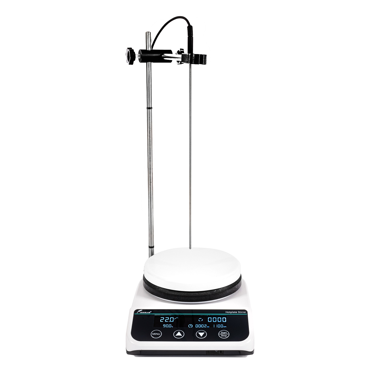 Podstawą HS5S jest ceramiczna podstawa o średnicy 135 mm, która jest wyposażona w zakres ogrzewania 0-270°C. Obrotowa podstawa o regulowanej wysokości jest dostarczana jako akcesorium, w tym termometr zanurzeniowy, który stale monitoruje i kontroluje temperaturę cieczy, aby dopasować ją do ustawionej temperatury. Oprócz dostarczonego termometru, uchwyt może być również używany do przechowywania, na przykład, szklanego termometru, miernika pH itp. Oczywiście dostępna jest również