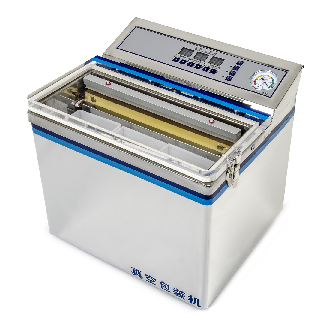 We wnętrzu pakowarki próżniowej znajduje się wydajna pompa olejowa o szybkości przepływu 1,3 l/s, która zapewnia wystarczająco szybkie odsysanie powietrza. Czas wymagany do odessania powietrza wynosi od 30 do 60 sekund w przypadku produktów spożywczych. Na panelu sterowania znajduje się również manometr do monitorowania aktualnego ciśnienia w komorze.