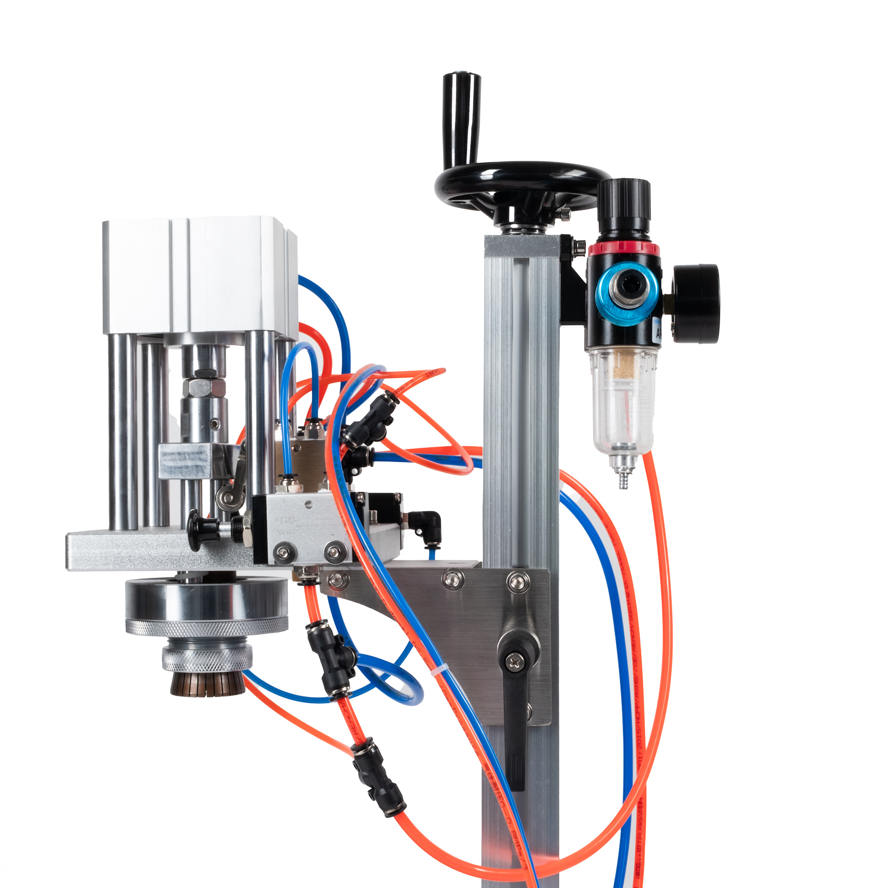 Opis funkcji. Sprężone powietrze napędza głowicę prasującą, do której wkładana jest butelka z zamontowanym kapslem.