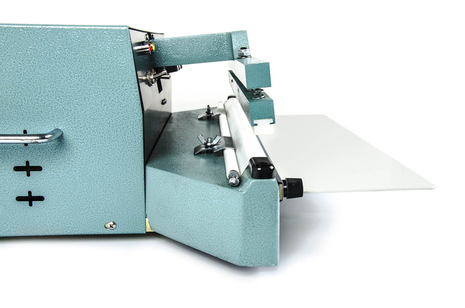 Dolna szczęka zgrzewarki zawiera grzejny drut oporowy o długości 450 mm i szerokości 10 mm, który jest pokryty teflonową folią PTFE, która zapobiega przywieraniu plastikowego opakowania do drutu grzejnego, a także tworzy 10-milimetrowy wzór karbu spawalniczego. Ta odporna na ciepło folia jest nawinięta na pręt, który jest umieszczony z tyłu dolnej szczęki. Pręt ten służy jako zbiornik na taśmę PTFE w celu łatwej wymiany w przypadku zużycia. Taśma PTFE może być wymieniana (ponownie powlekana) przez operatora bez żadnej wiedzy lub narzędzi. Śruby służą do ręcznego odkręcania.
