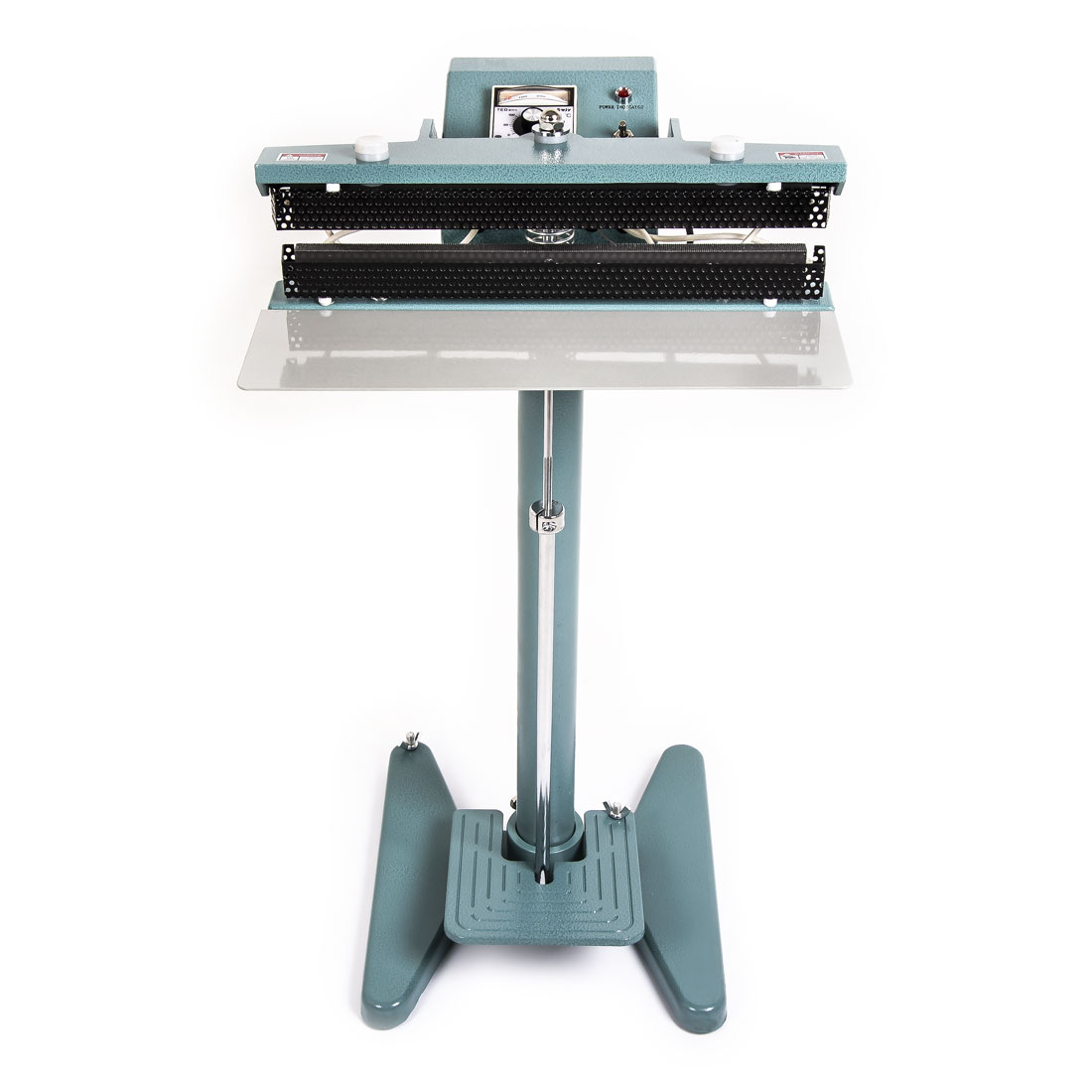 Całkowicie metalowa zgrzewarka stojąca do folii z dwiema stale podgrzewanymi listwami zgrzewającymi PFS-DD400 z pedałem nożnym i regulowaną wysokością podparcia - stół do worków